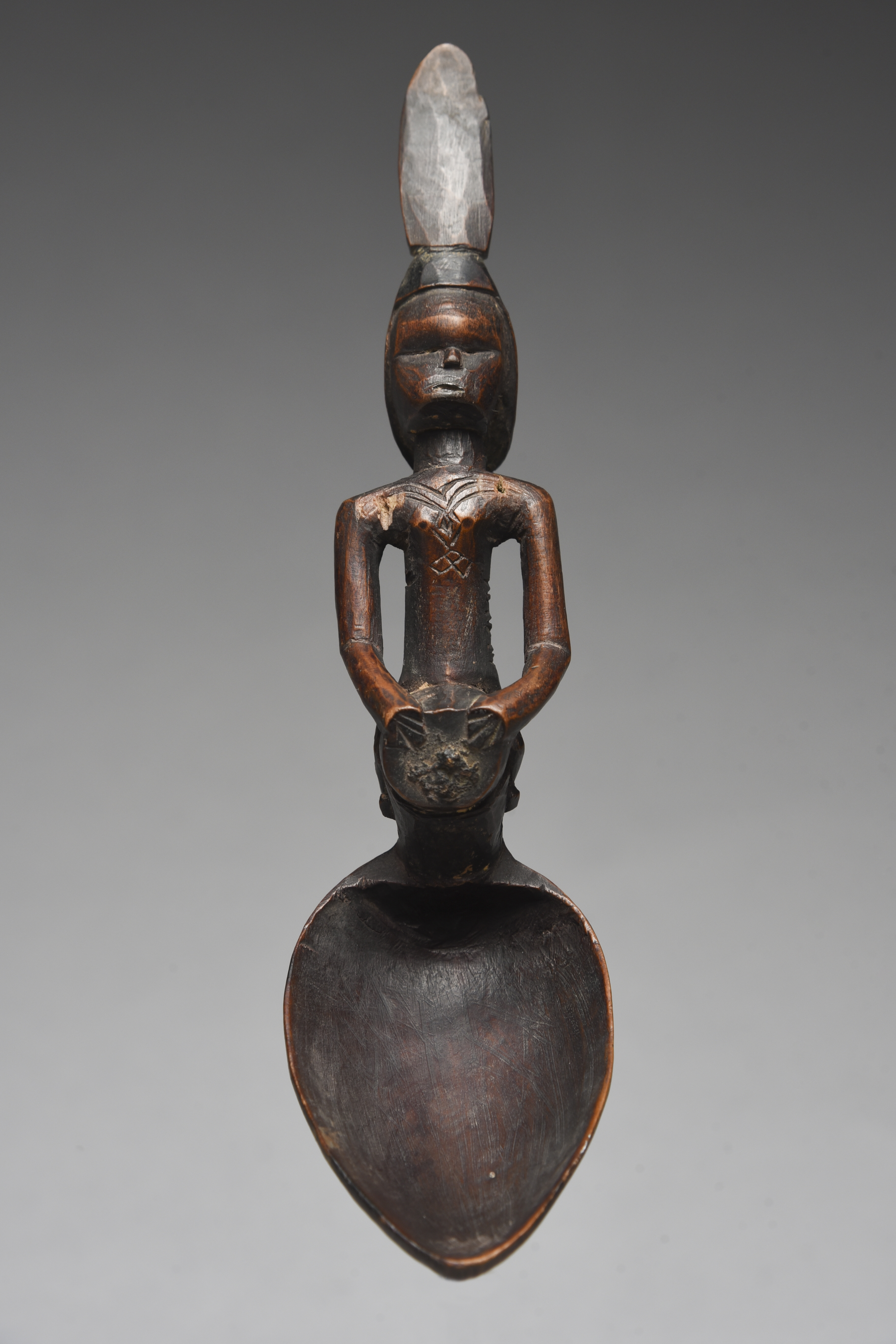 the handle carved as a figure astride a drum and with torso scarifications and a tall headdress,