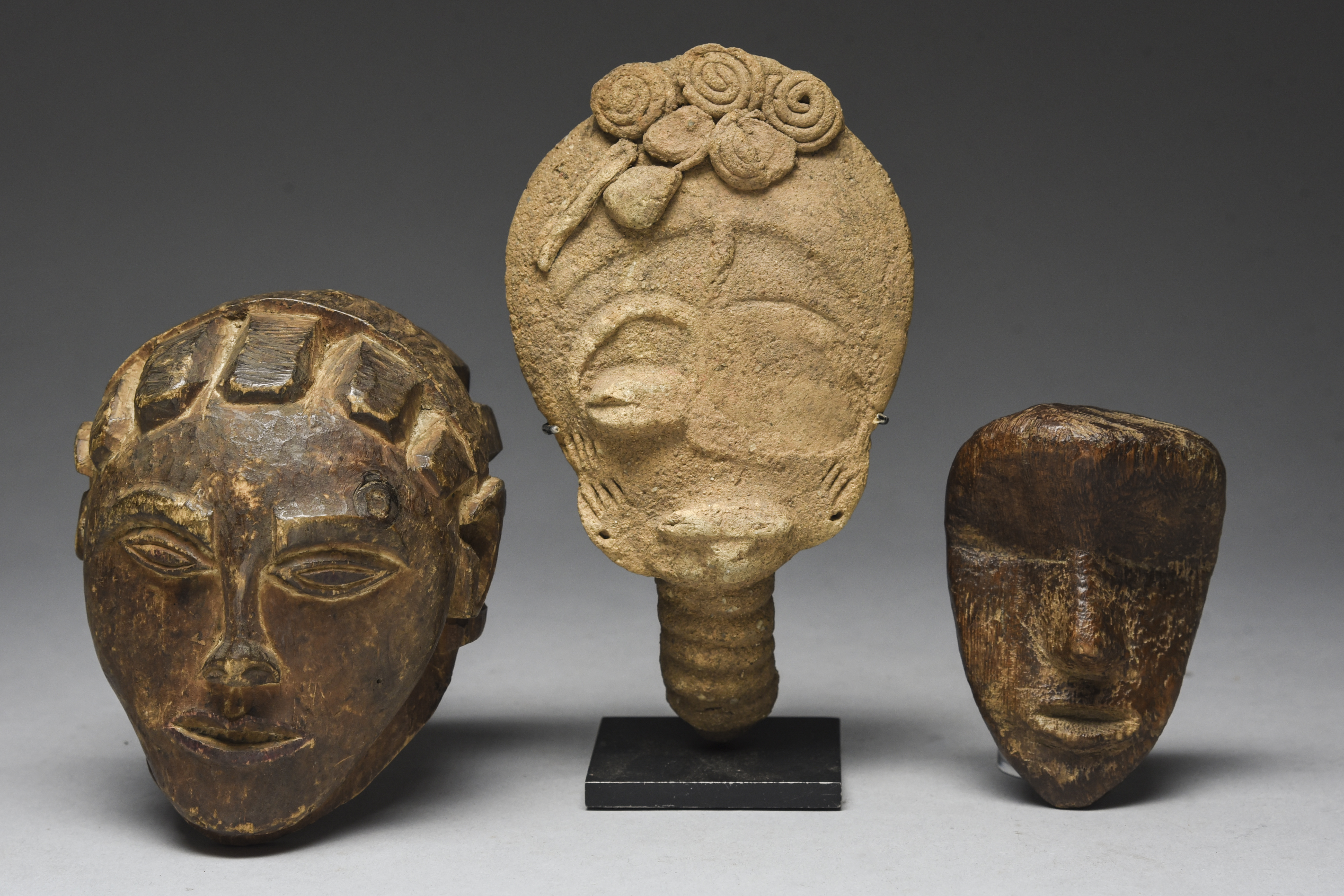 a West African mask, with a ribbed coiffure, 14cm high, and an Akan terracotta head, 17.5cm high, on stand. (4)