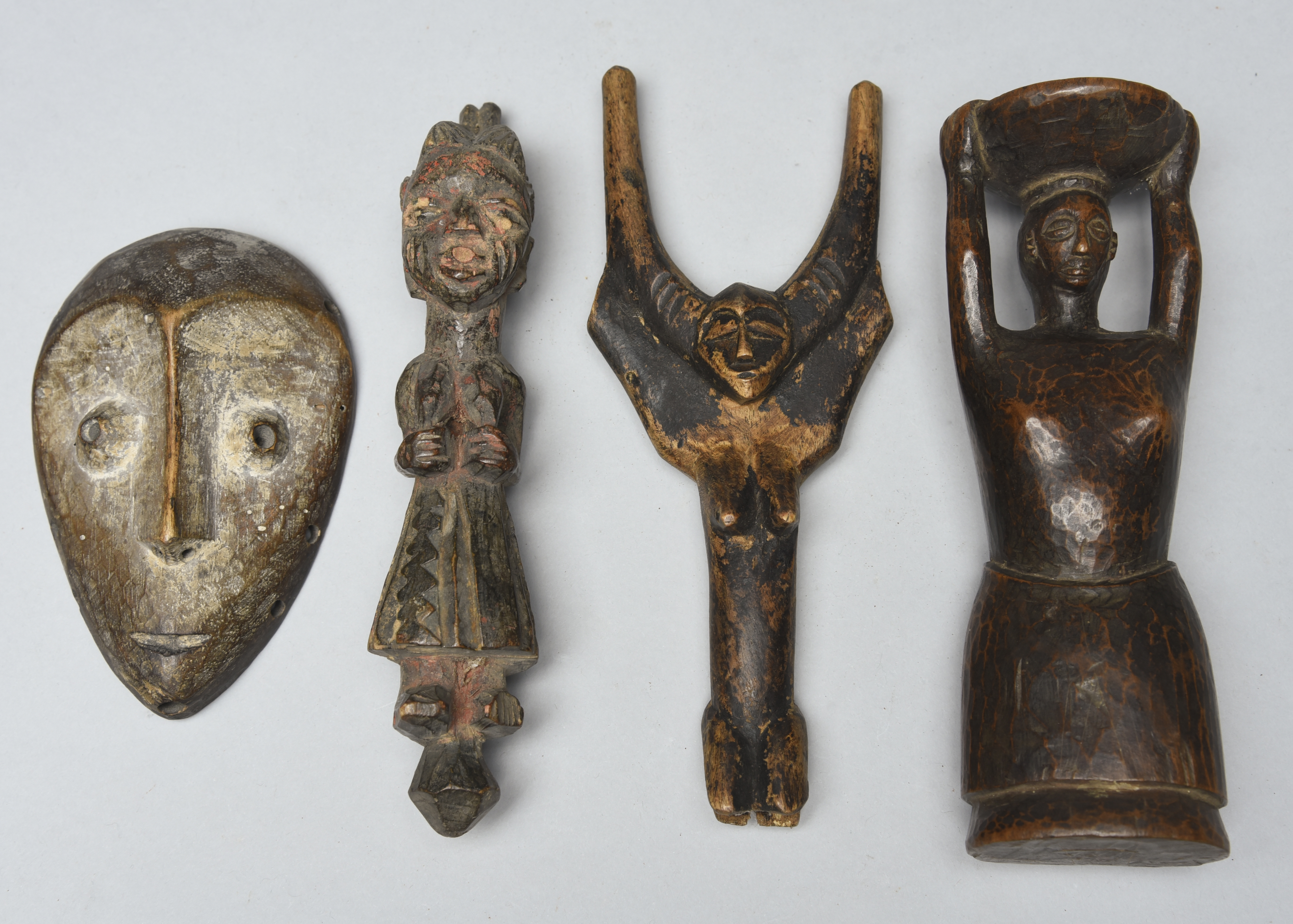 a small Lega mask, 13.5cm high, an Ivory Coast catapult, 21cm high and a Gabon female figure supporting a bowl on her head, 9cm high. (4)