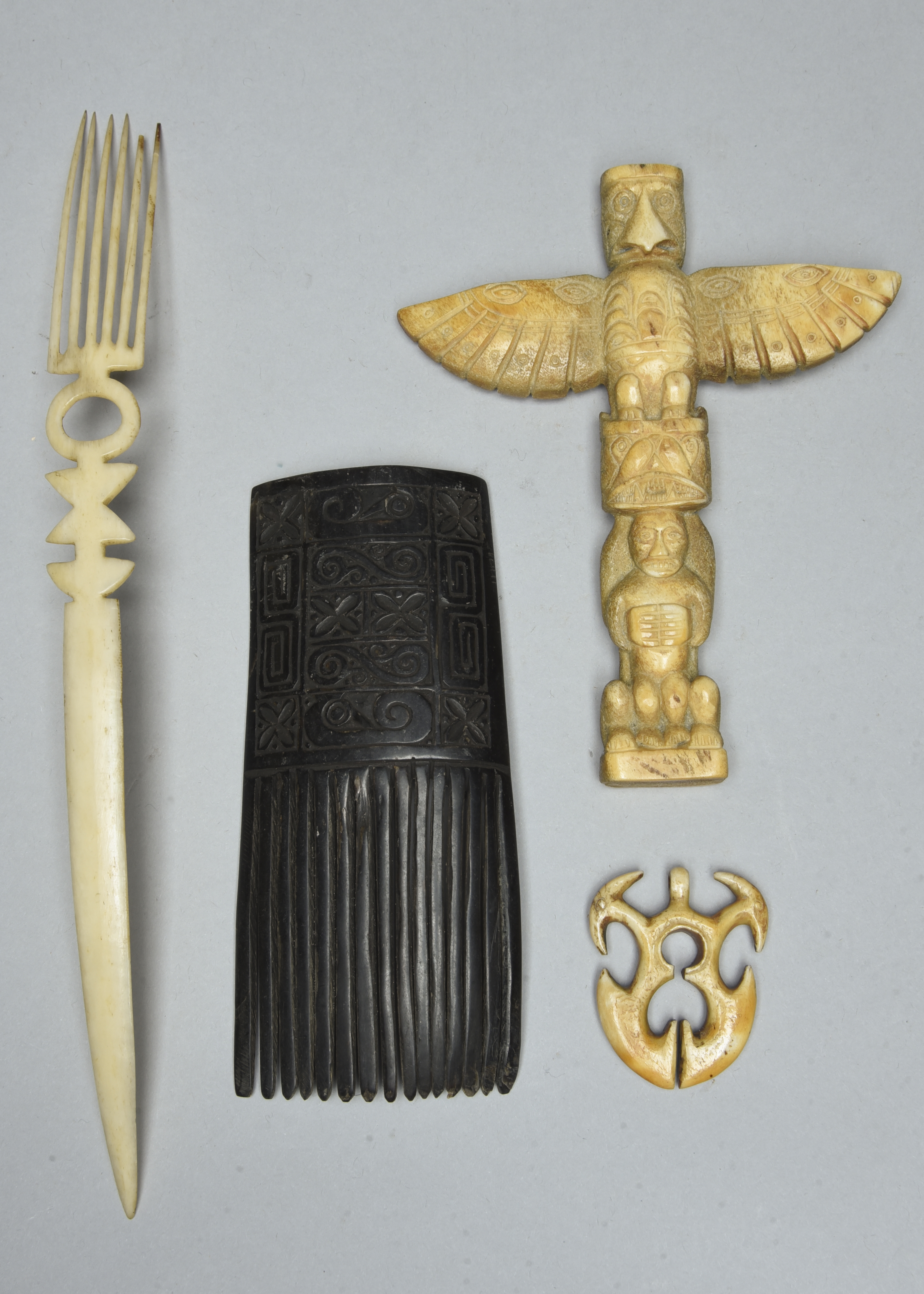 a Northwest Coast carved bone model totem pole, 13.7cm high, an Indonesia carved turtle shell comb, 14.3cm high, and an Indonesian bone pendant, 5cm high. (4)