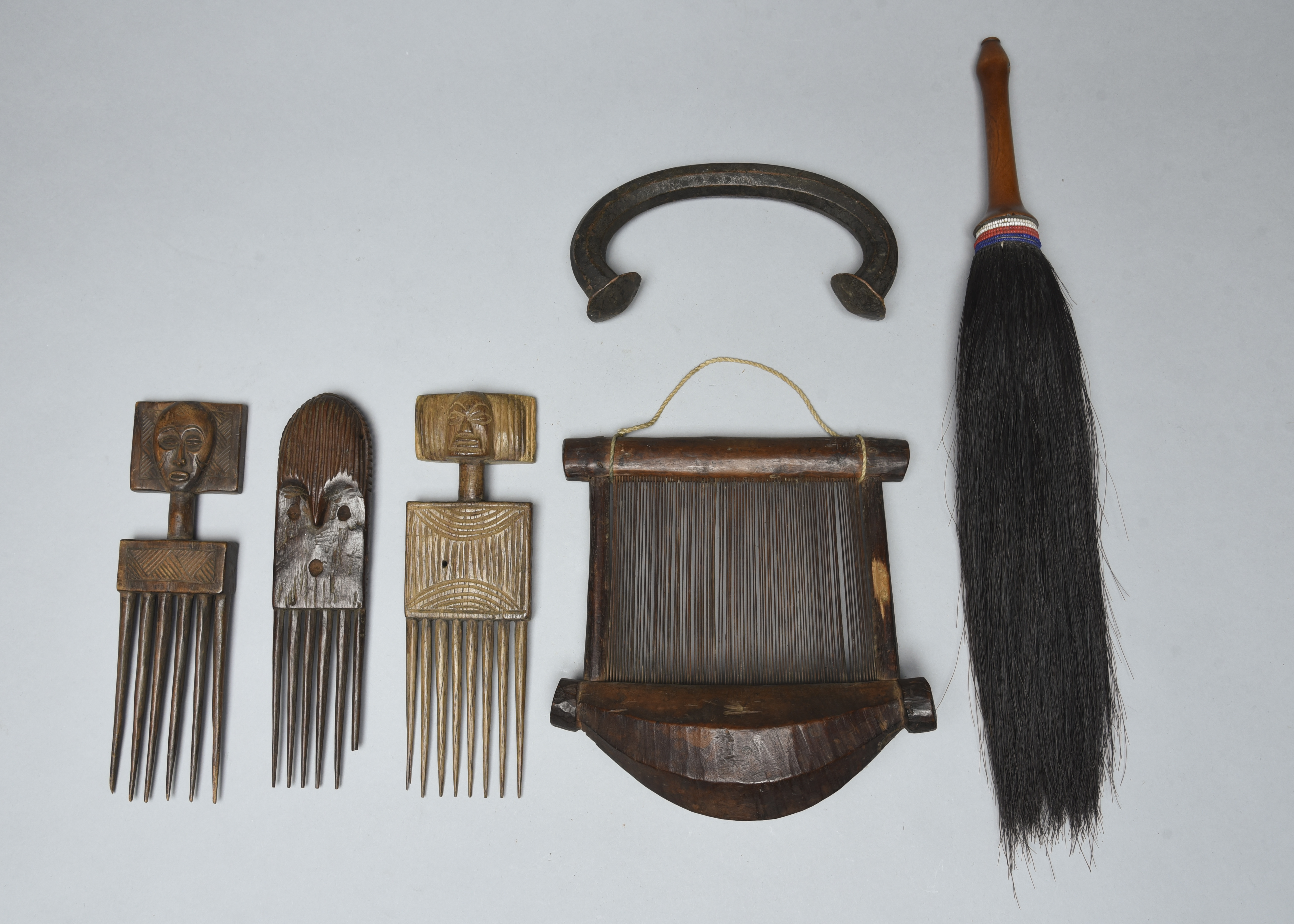 a Baule loom, 19cm wide, a Maasai fly whisk, 47cm long, two Chokwe combs and another comb. (6)