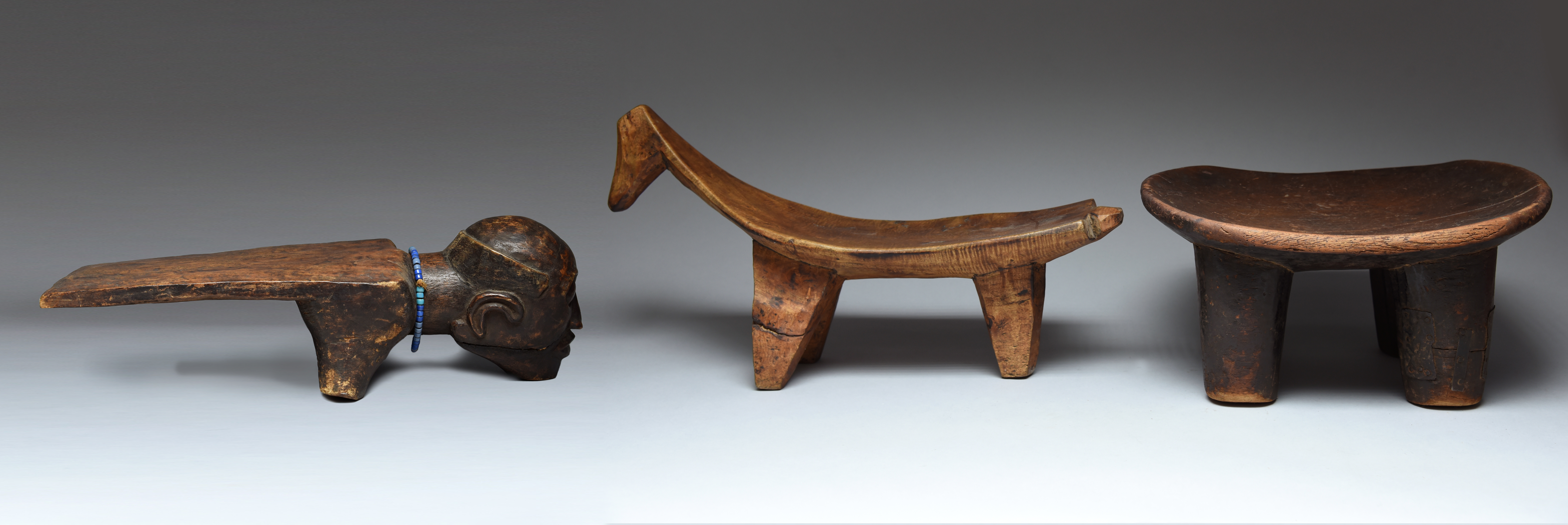 a Gurunsi zoomorphic tripod stool, 58cm long and a stool with a carved head of a man, with his chin acting as a support, with a glass bead necklace, 60cm long. (3)