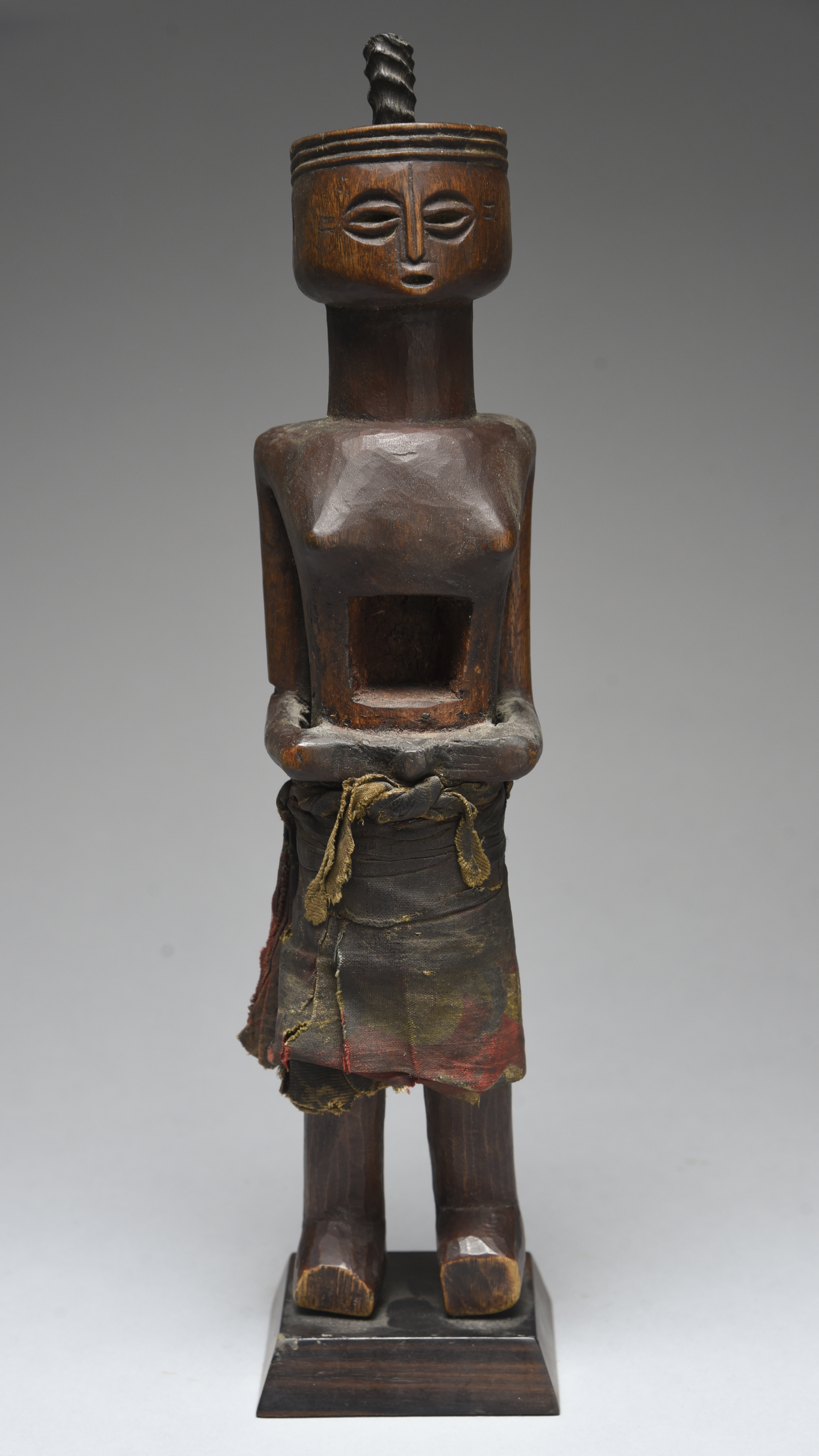 female with a horn insert to the top of the head and with a charge recess to the abdomen and wearing a cloth skirt,