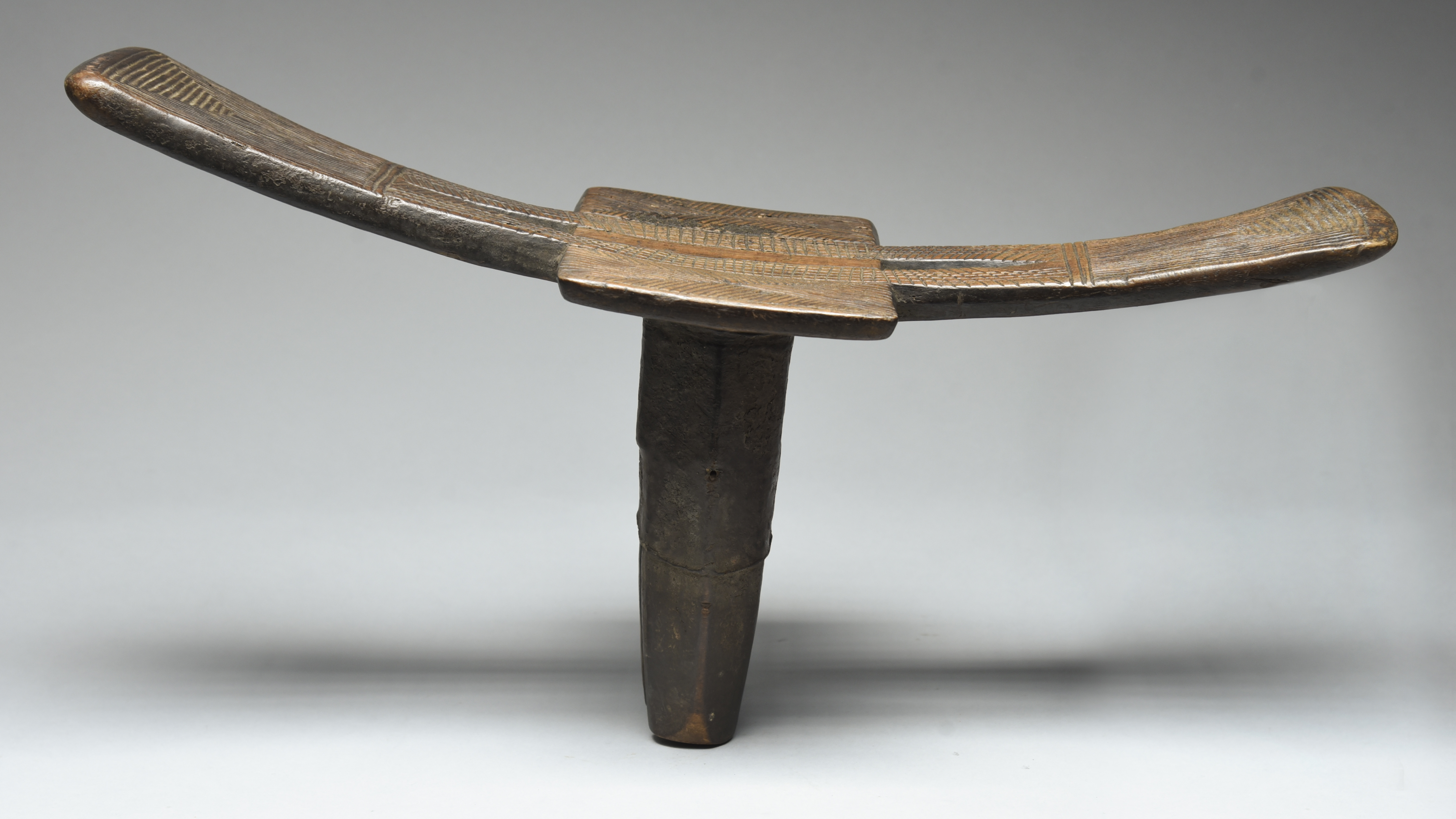 curved and pierced with carved linear and diaper decoration, the central support with a leather sleeve,
