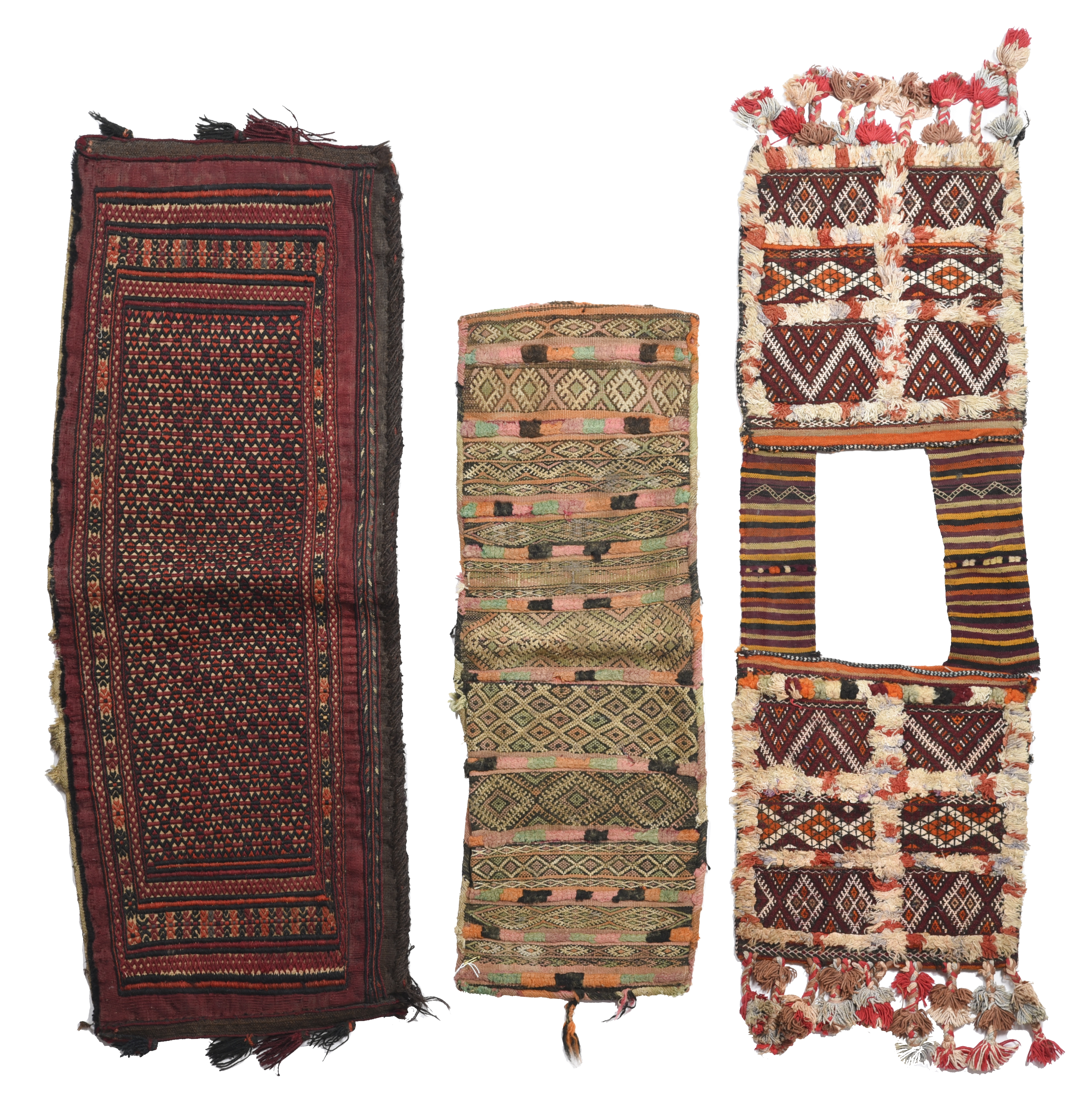 a Berber double saddle bag, High Atlas, wool with a tapestry weave, 110cm x 34cm and a Berber saddle bag, Handira People, High Atlas, with an opening to one side, 78cm x 28cm. (3)