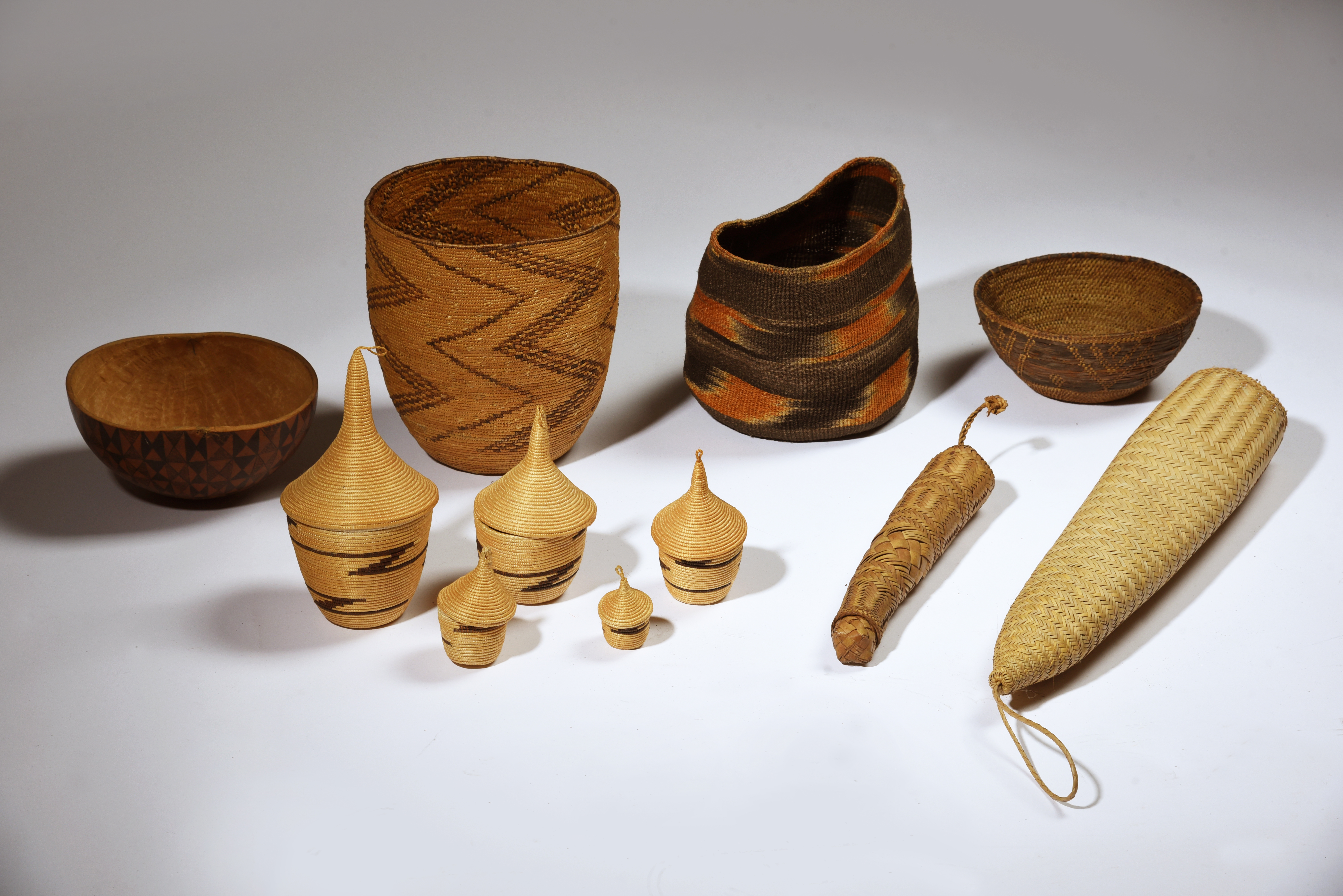 a large Tutsi basket, a bowl, a basket, a calabash and two conical woven ornaments. (16)