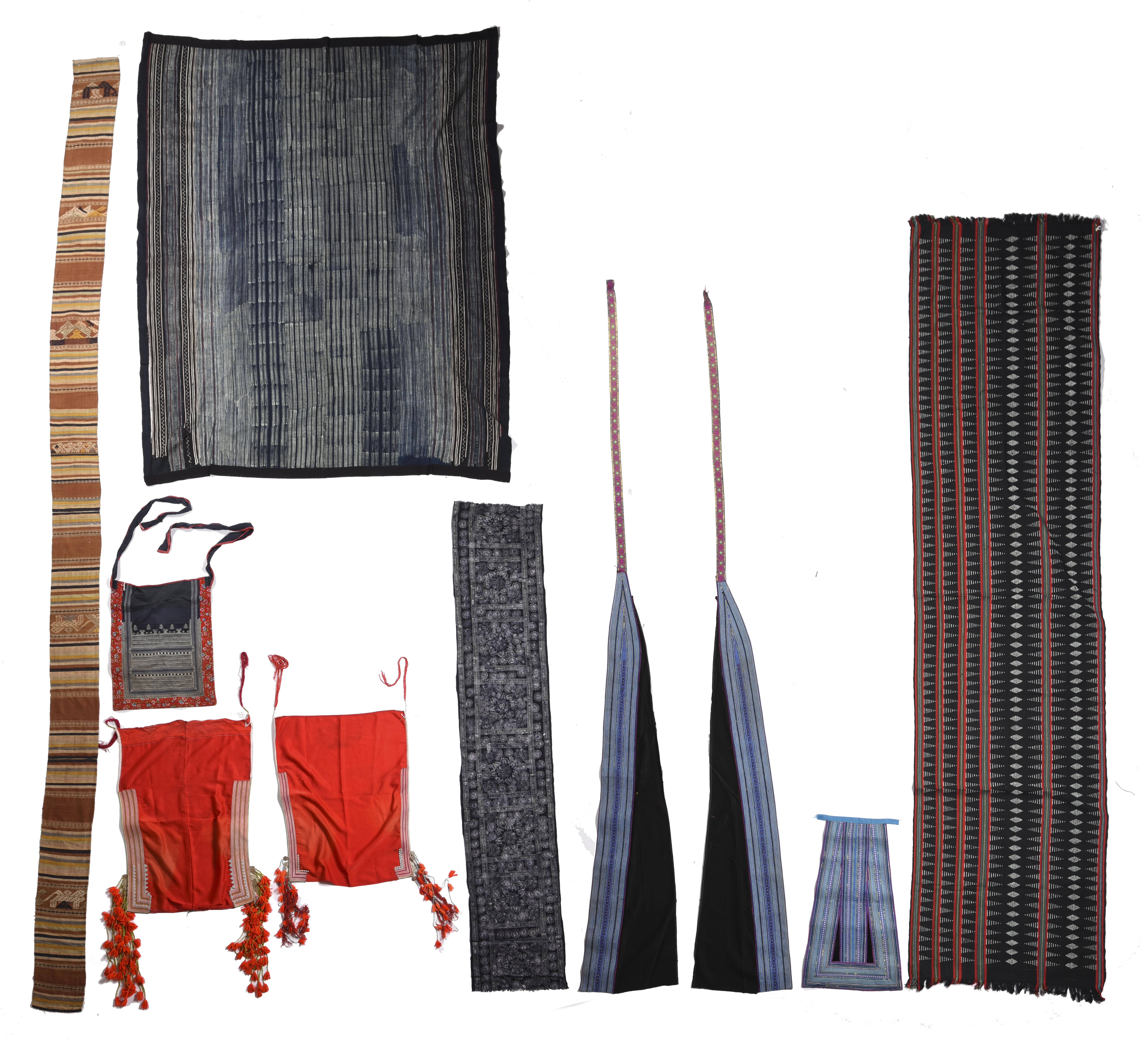 a Vietnam silk supplementary weft length, 380cm long, a Vietnam hand woven hanging with beadwork, 280cm long, two Vietnam indigo batik cloths, a Hmong apron and a Hmong apron and leggings. (10)