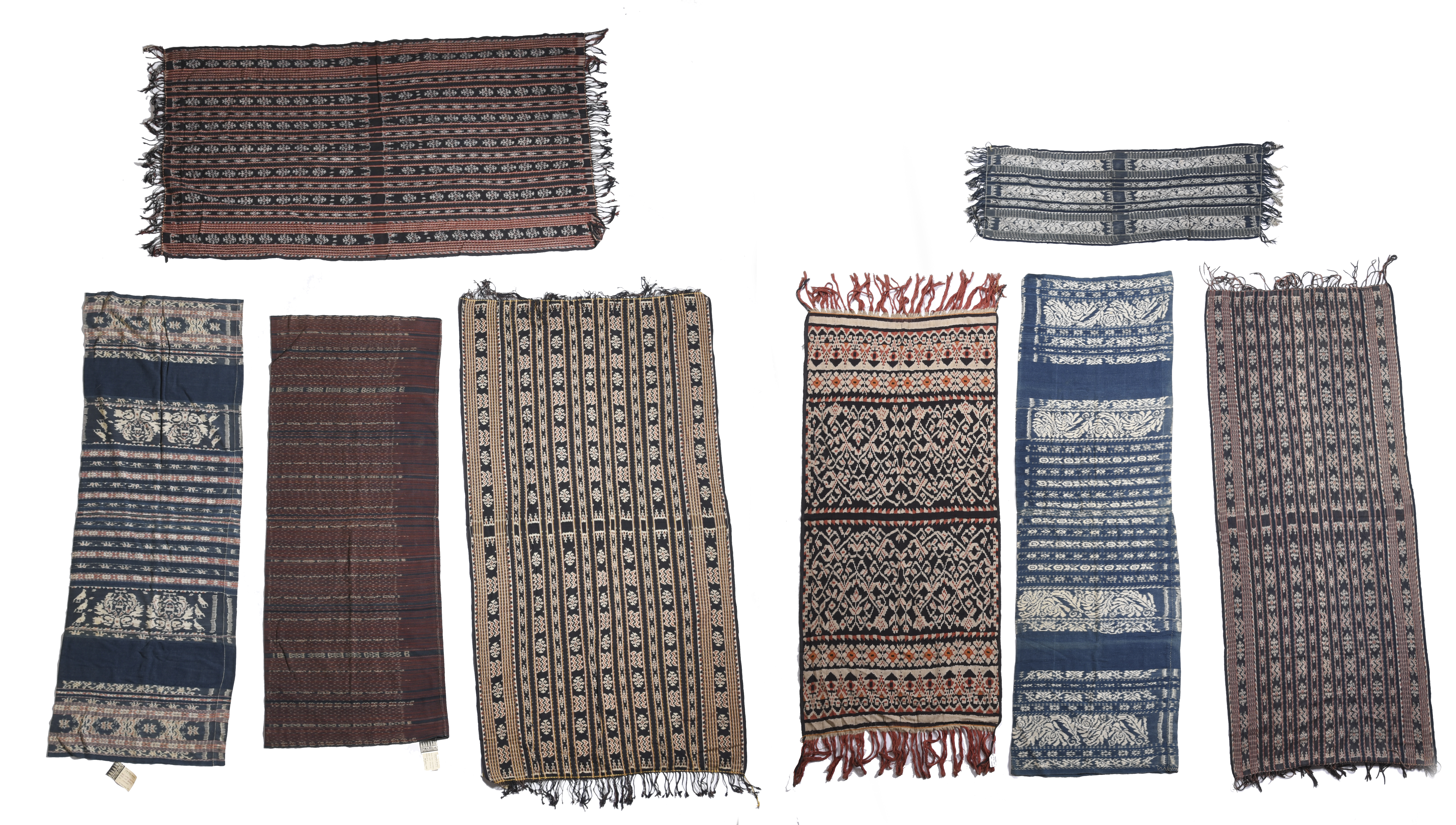 Suva including three shawls, 154cm, 160cm and 169cm long, a sarong, 177cm long, and a short cloth, 103cm long; Roti including a sarong, 159cm long and a selendang, 150cm long; a Lembata sarong, 147cm long. (8)