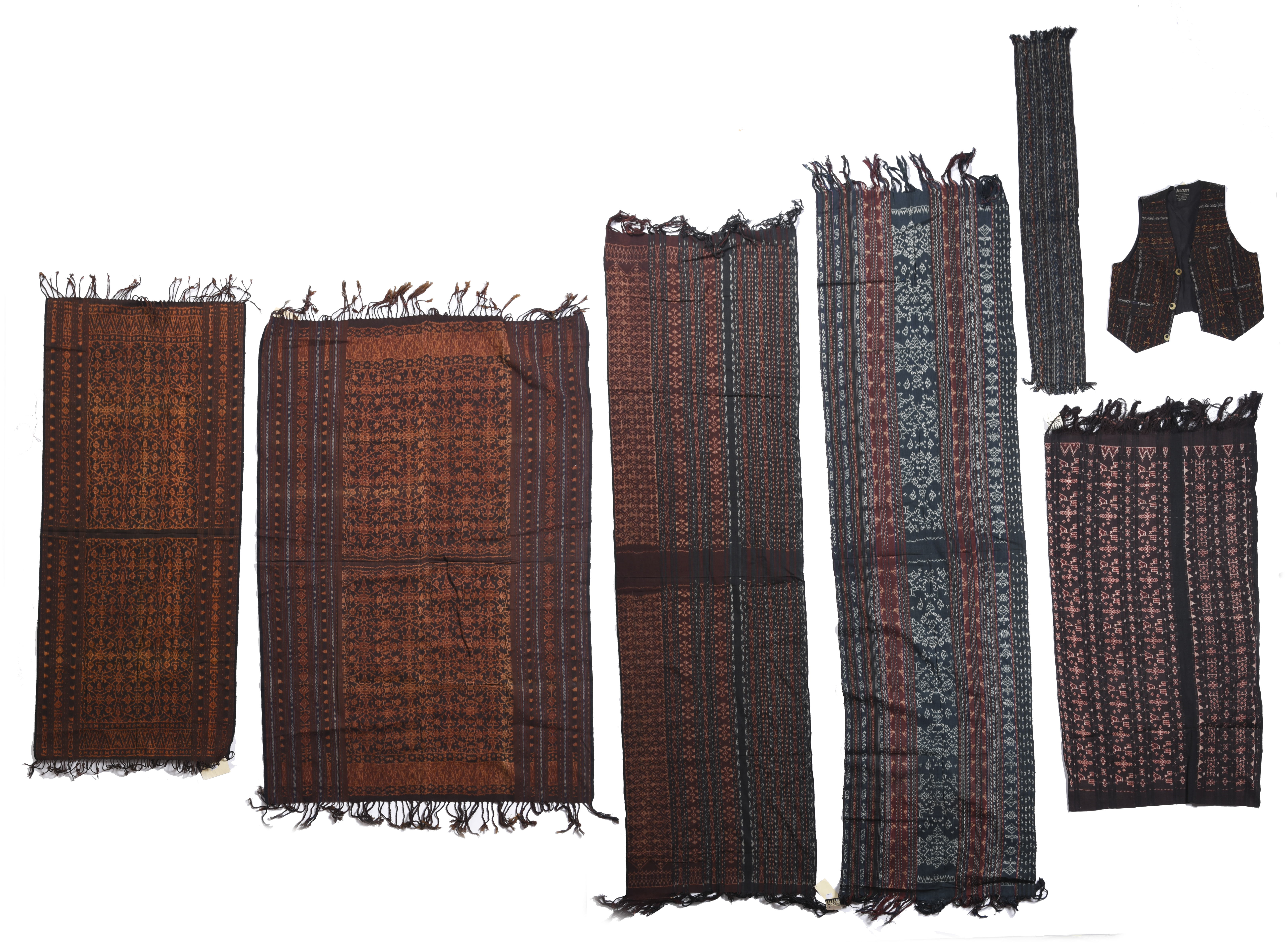a Flores cotton ikat scarf, 130cm long, two Flores cotton ikat shawls, 150cm and 156cm long and a Flores ikat waistcoat. (7)