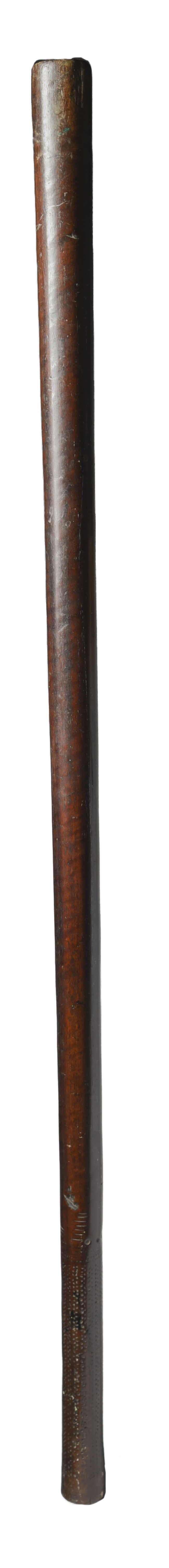with a notch carved grip and with a series of scored 'kill' marks above and with a concave butt, pierced at the edge for attachment, 19th century,