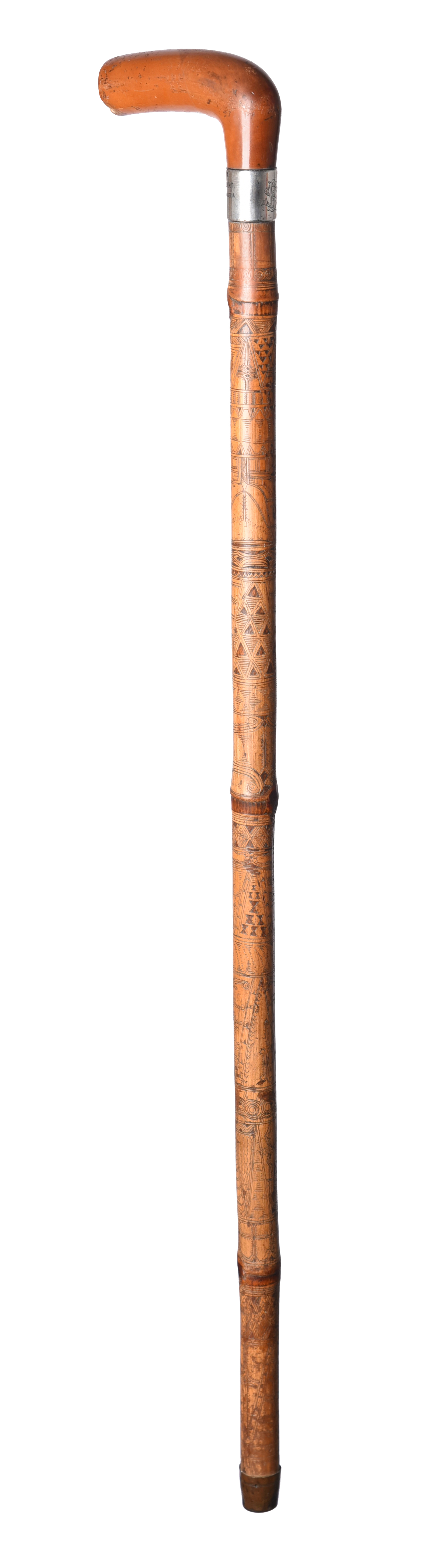 with bands of symbols, geometric patterns, frigate birds and fish, mounted as a walking stick with a wood handle and a silver collar, engraved a monogram SE and inscribed IN MEM : REV. J. HOLFORD PLANT. MISSIONARY PRIEST IN MELANESIA, Birmingham hallmark for 1890,
