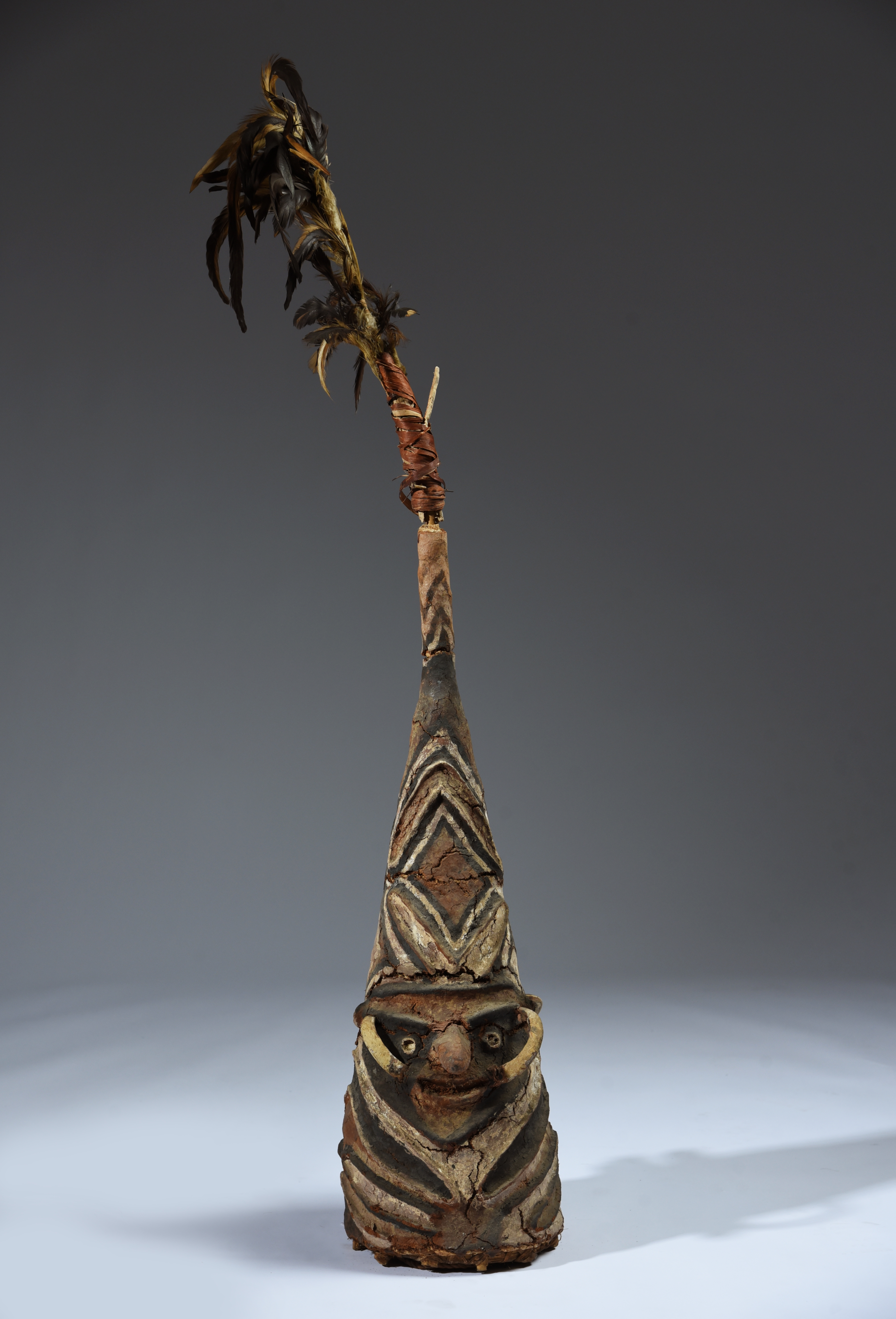 fibre and mud with boars tusks and pigment decoration, with a fibre bound feather finial,