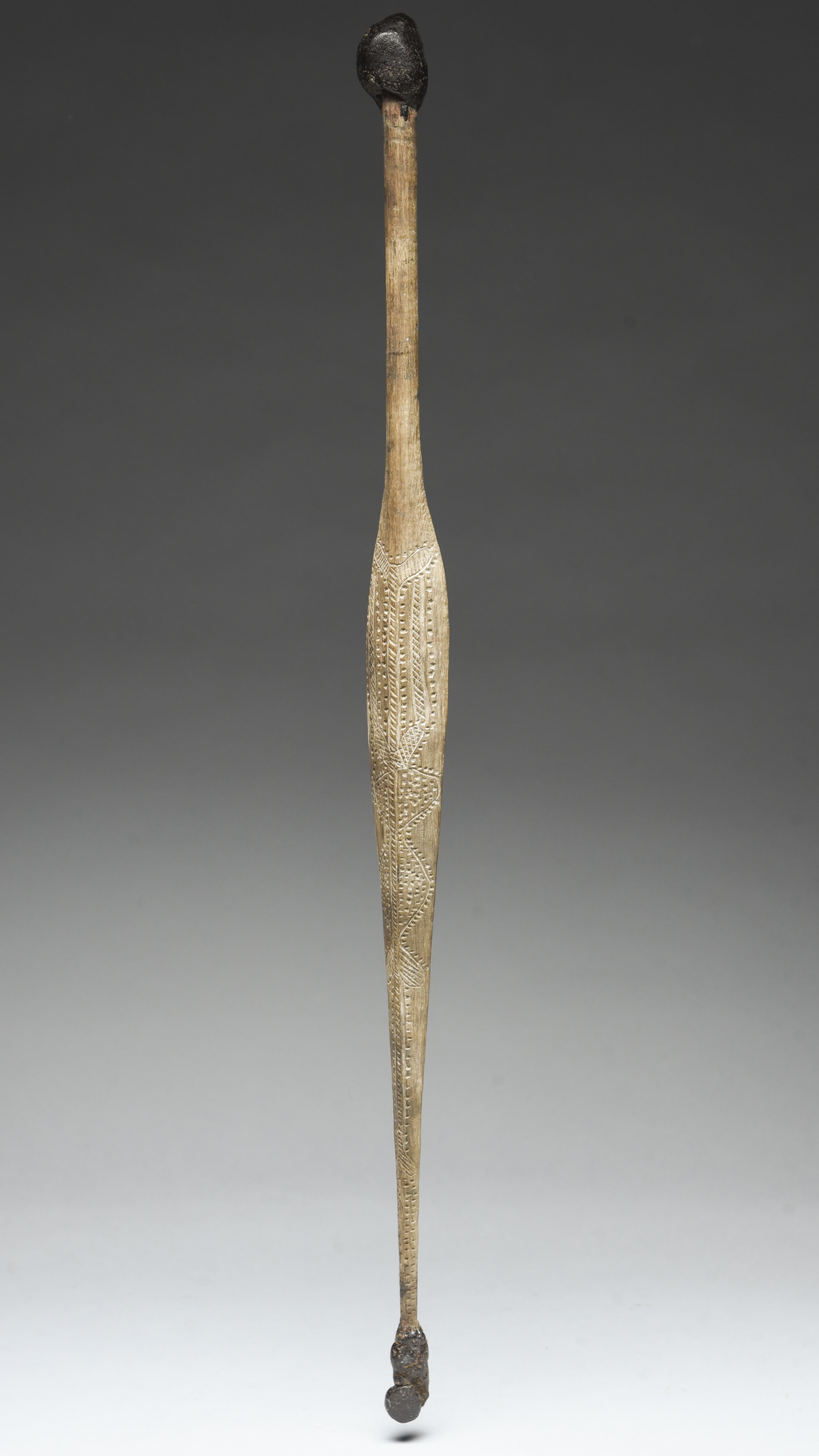 with stylised carving to both sides, the front with emu tracks and red pigment, the ends with gum, one with remains of the bone spike, 19th century,