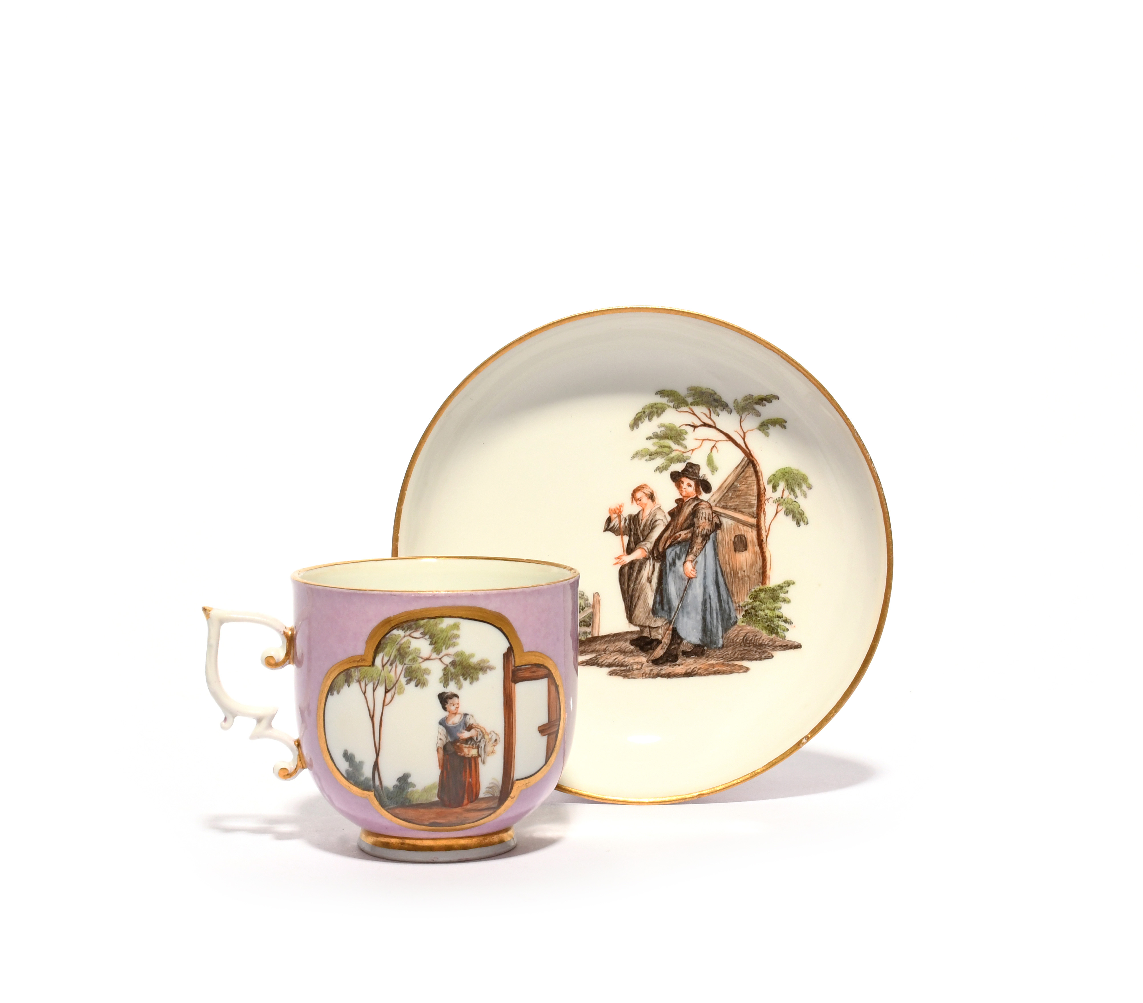 A Meissen coffee cup and saucer, c.1745, the cup painted with quatrefoil panels of peasants, including a traveller in a black cloak watched by a girl in a window, reserved on a powdered purple ground, the saucer paintyed with two peasants beneath a tree, the underside with the same powdered ground, blue crossed swords and gilt G marks, 13.2cm. (2)