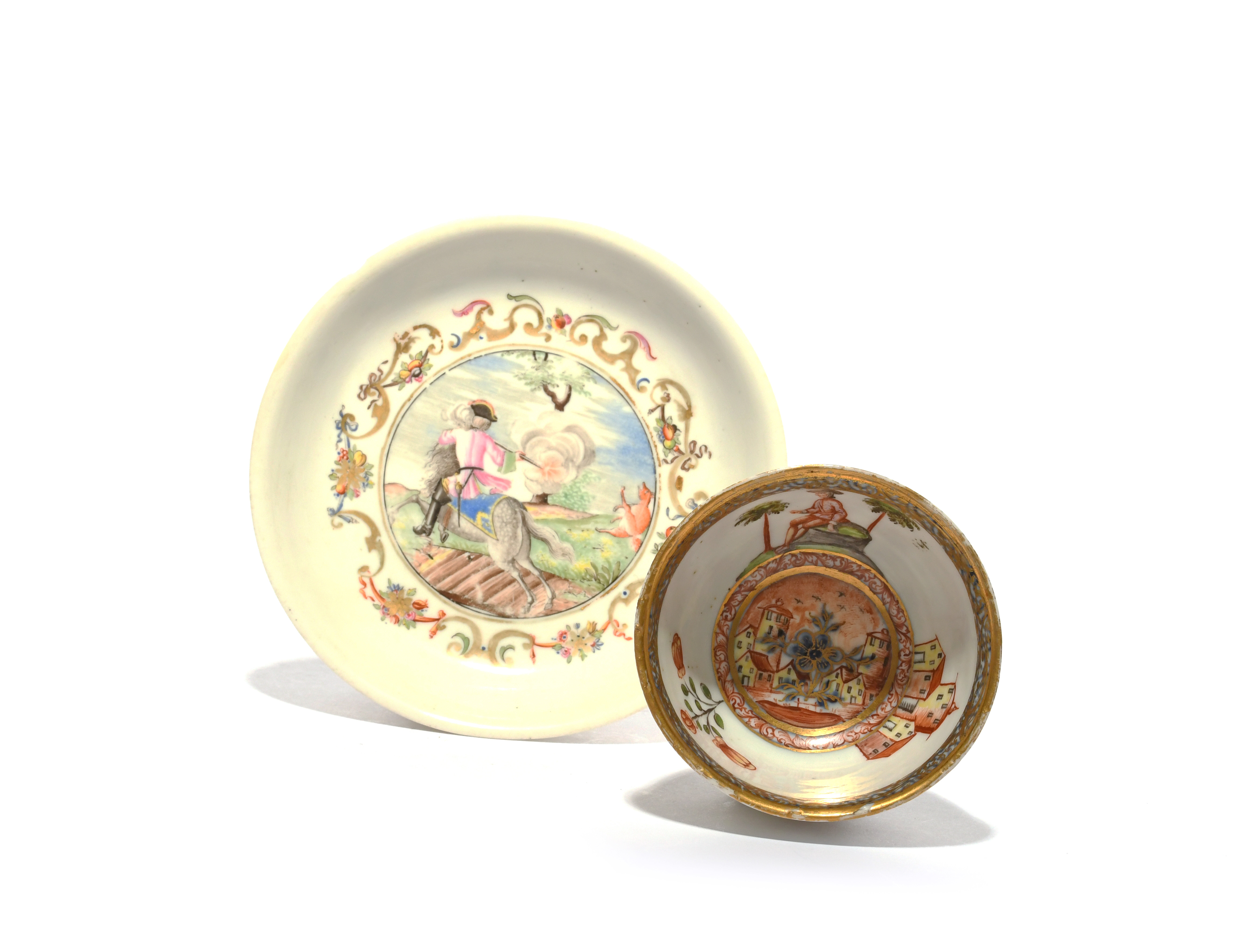 A Meissen hausmaler-decorated saucer and a teabowl, c.1730, the teabowl originally decorated in the Fels und Vogel pattern, embellished with gilding and enamels in the workshop of F J Ferner with a gentleman seated on rocks between palm trees, with buildings and a rose spray, the saucer possibly decorated in Bayreuth with a hunter on horseback shooting a fox, within a circular border of fruit, flowers and ribbon scrolls, the underside sprigged with prunus and brightly enamelled, blue crossed swords mark to the teabowl, small rim nibbles, 13cm max. (2)