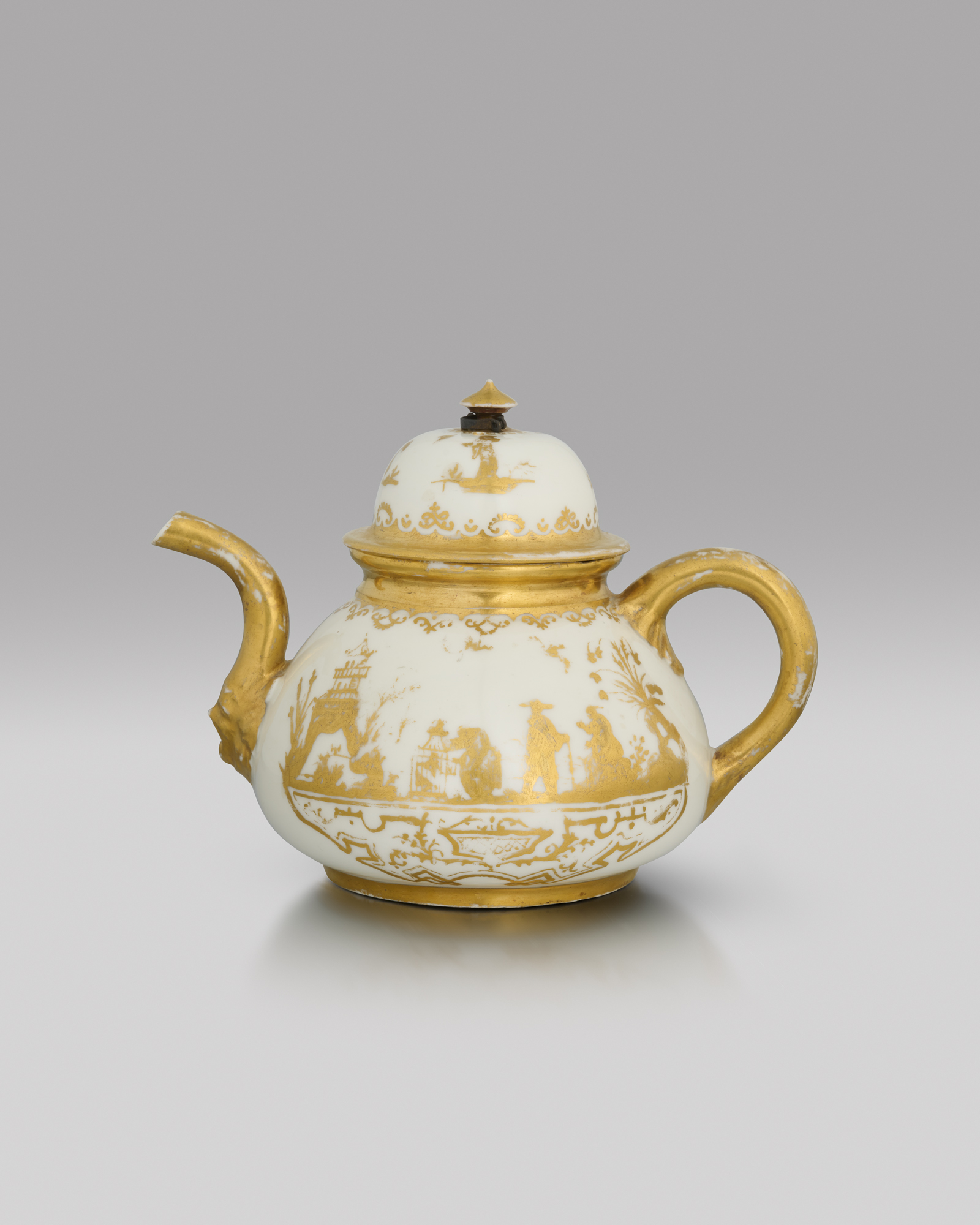 A Meissen hausmaler goldchinesen teapot, c.1720-25, decorated in Augsburg or Dresden with gilded Chinese figures at various pursuits in garden settings, between strapwork borders, the gilt spout issuing from a mask head, some gilt wear, two small chips to the cover, 16.2cm across. (2)