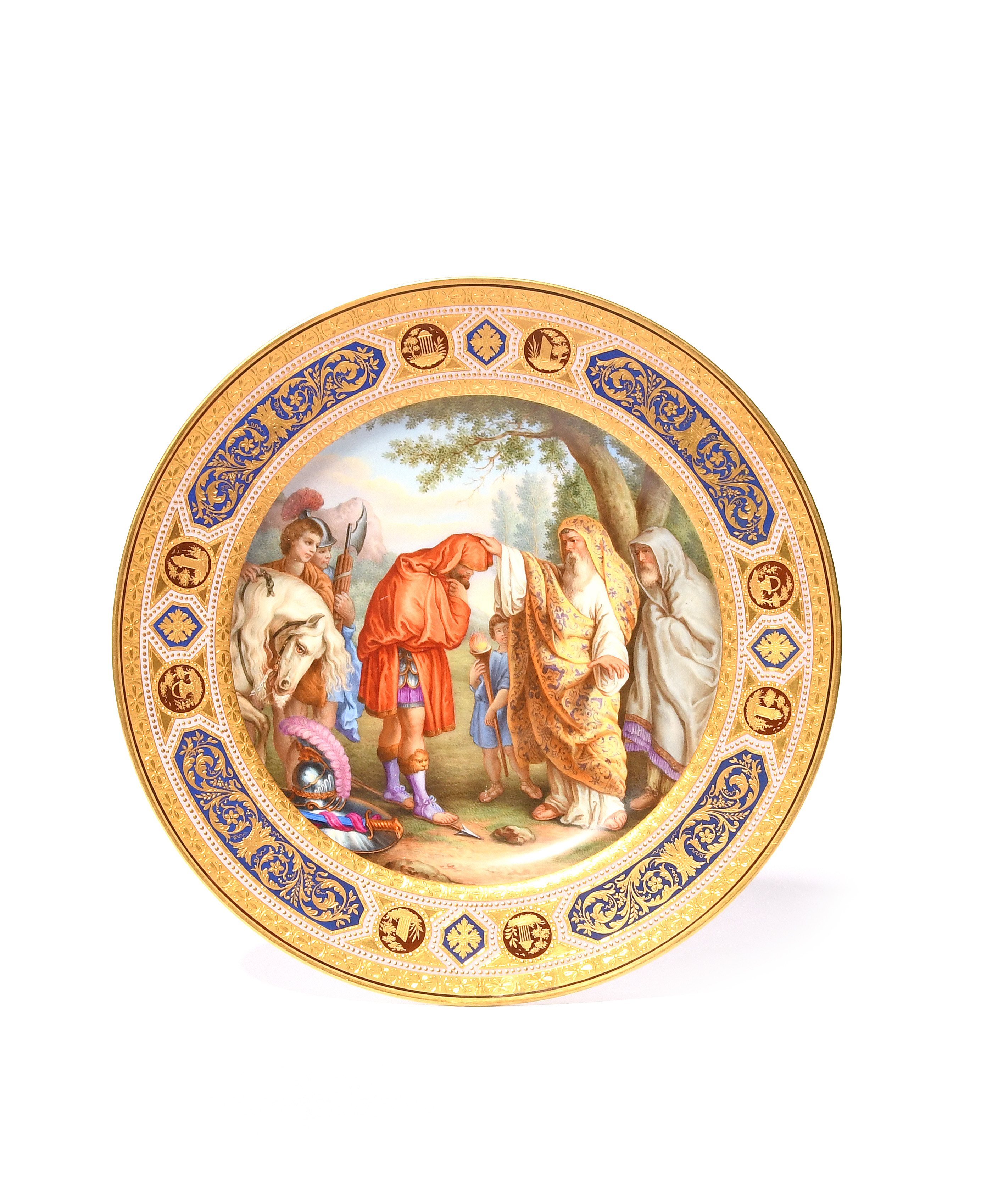 A Vienna cabinet plate, date code for 1825, finely painted with Samuel anointing King Saul, the rim with panels of Classical ruins and foliate scrolls reserved on blue and brown grounds on an elaborate raised gilt ground, titled 'Saul als König' to the reverse, blue shield mark, impress '43'; and '825', a small filled rim chip and associated crack, 24.5cm.