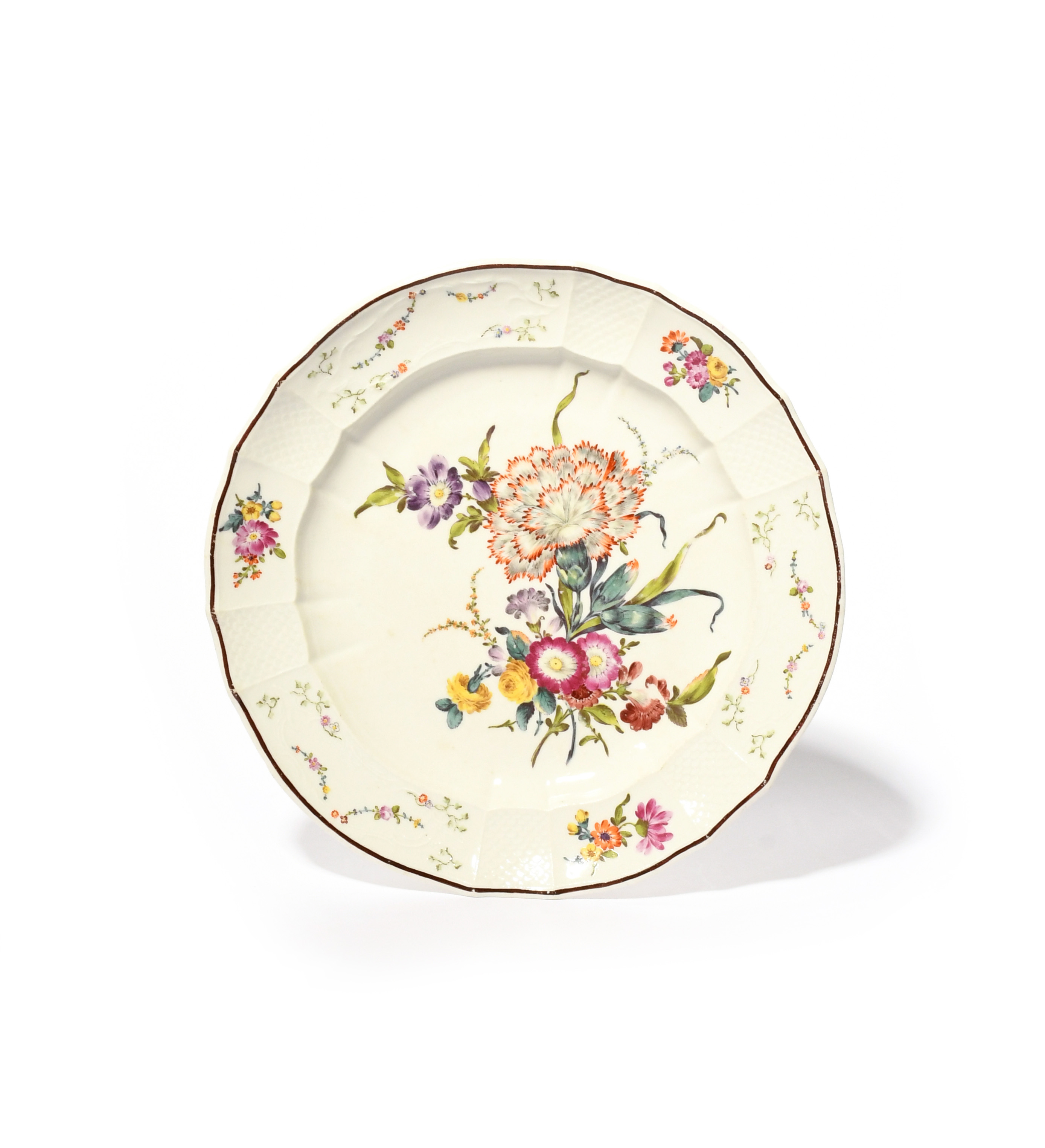 An early Furstenberg plate, c.1765, painted to the well with a large arrangement of flowers including a carnation and auricula, the rim with scale moulded panels alternating with flower sprays, blue F mark, 24cm.