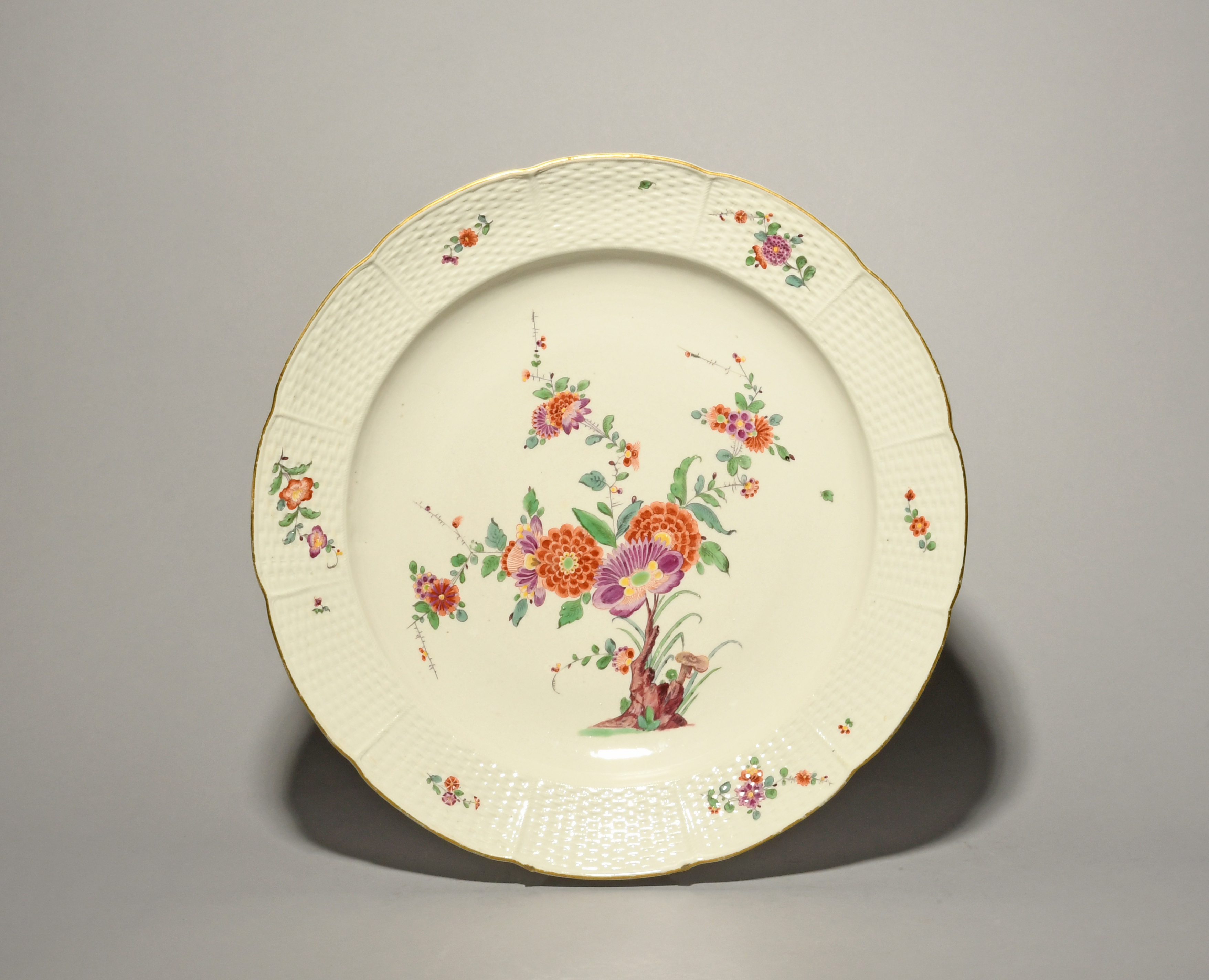 A massive Frankenthal dish or charger, c.1760, painted in the manner of A F Löwenfinck with flowering branches in an extended Kakiemon palette, the rim with basketweave moulding and small scattered sprigs, blue lion rampant mark, 39.5cm.