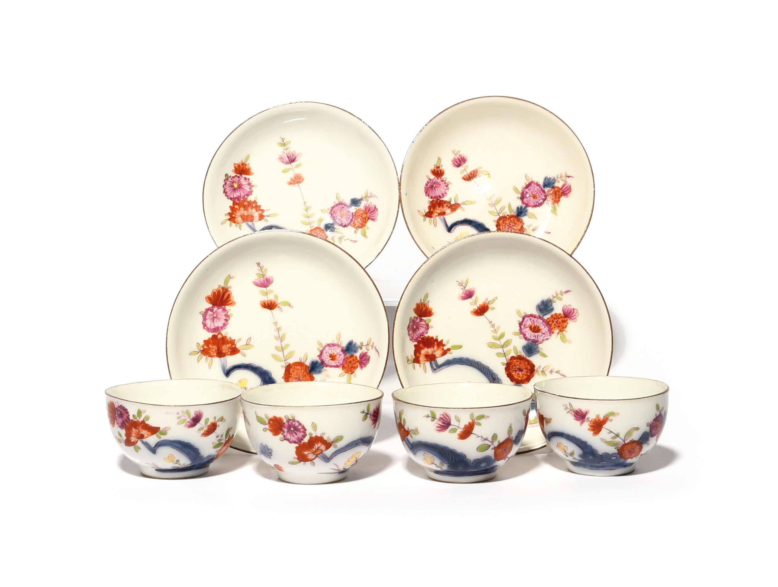 Four Meissen teabowls and saucers, c.1740, each painted in an extended Imari palette with flowering branches issuing from knotty rootwork, brown line rims, blue crossed swords marks, 12.2cm. (8)