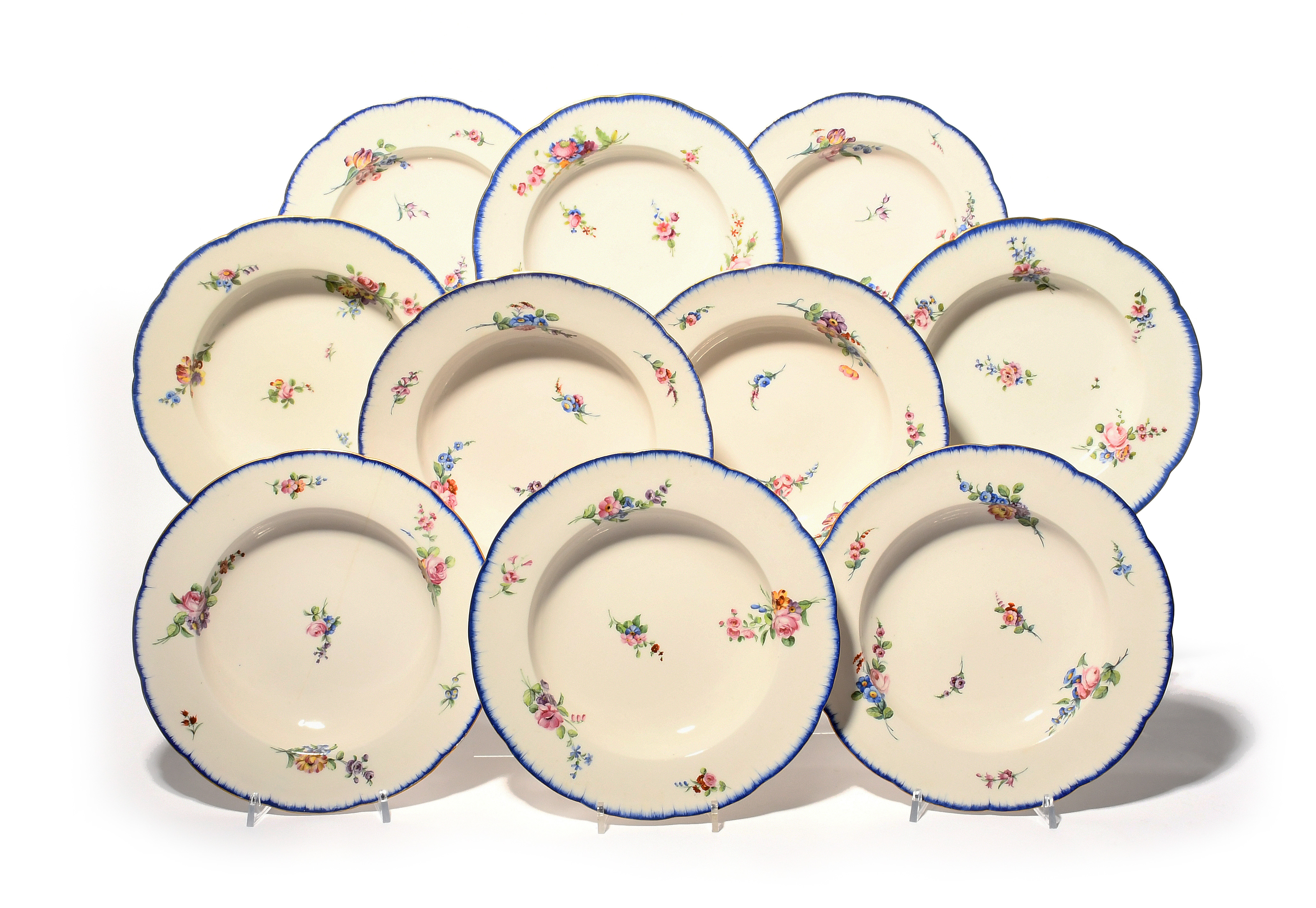 Ten Sèvres soup plates (assiettes à potage), date codes for 1782, painted with scattered flower sprays, the rims with a band of blue feathering, blue interlaced LL marks, painter's marks including Taillandier, 24.5cm. (10)