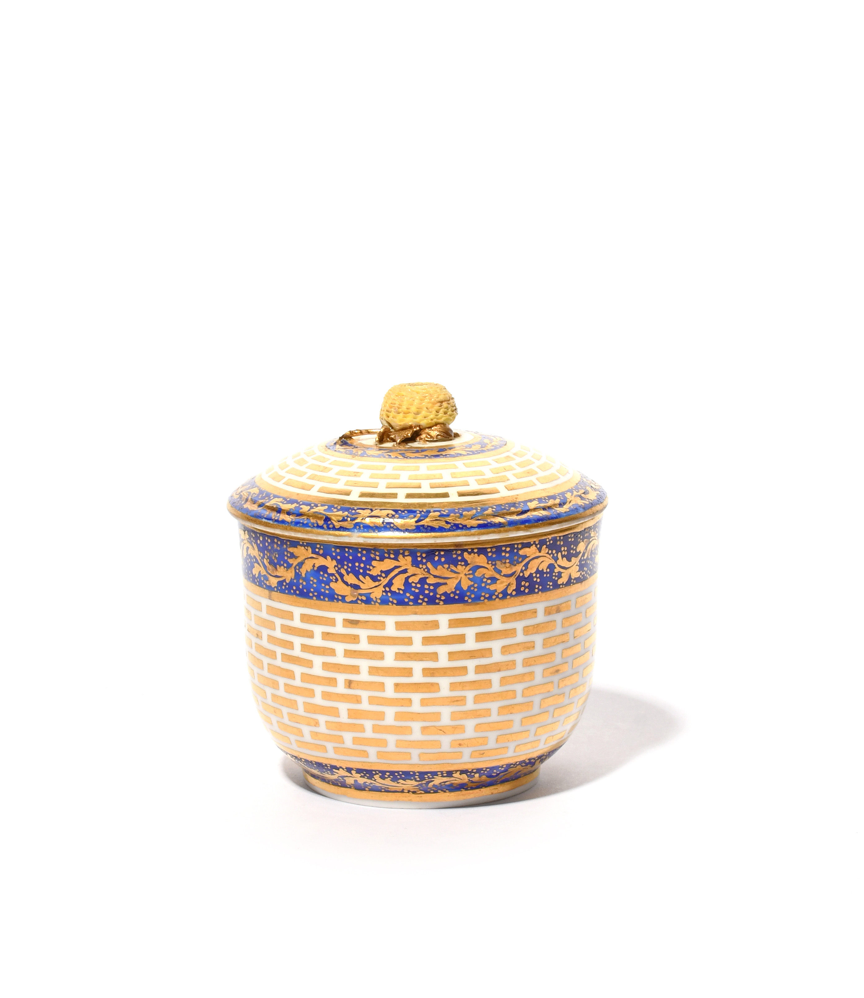 A Sèvres sucrier and cover, c.1770, decorated with a pattern of gold brickwork (briques d'or), the rims with a continuous gilt leaf border on a blue ground, blue interlaced LL mark, 10cm. (2)