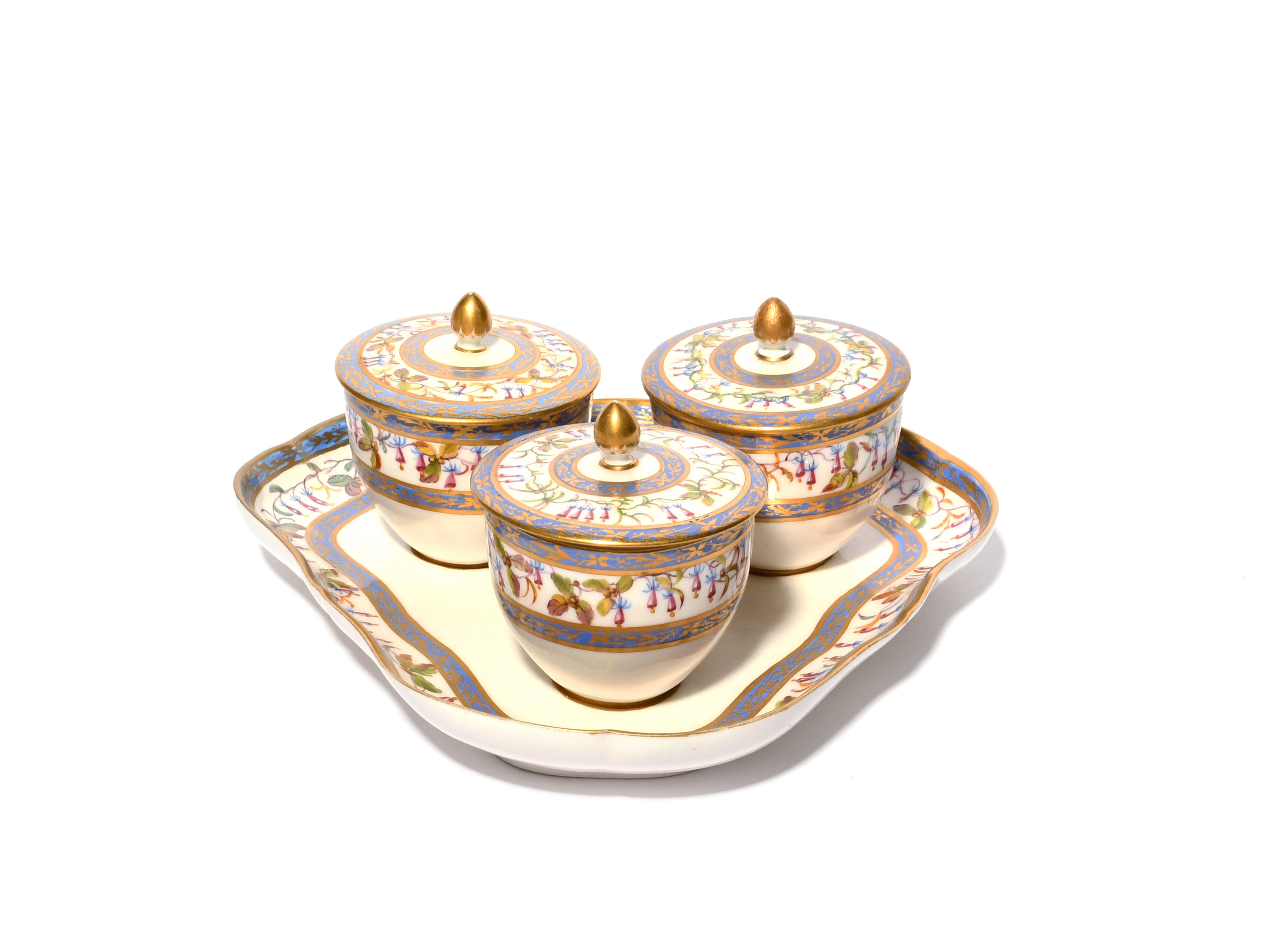 A Sèvres triple jam pot on a fixed triangular stand (plateau à trois pots de confiture), date code for 1787, from the Montmorin service, painted by Massy with a band of fuchsia between pale blue borders enclosing gilt foliate designs, blue interlaced LL mark enclosing date letters KK, painter's mark, one finial restored, 22cm across. (4)