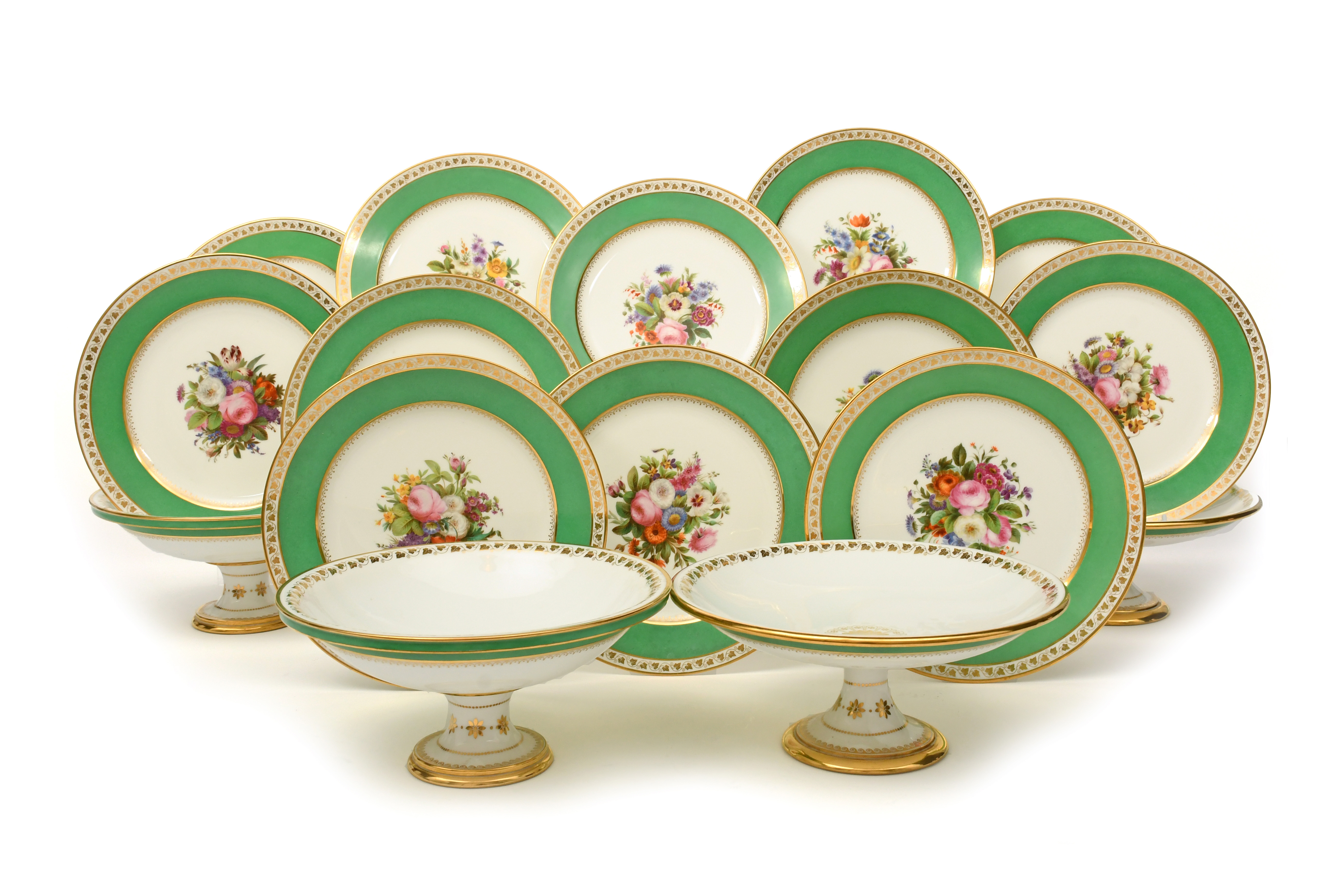 A Sèvres part service, mid 19th century, finely painted with arrangements of European flowers including convolvulus, rose, love-in-a-mist and dahlia, within rich green border and narrow bands of gilt vine, blue printed marks dated 1843. Comprising: twelve plates and four tazzae. (16)