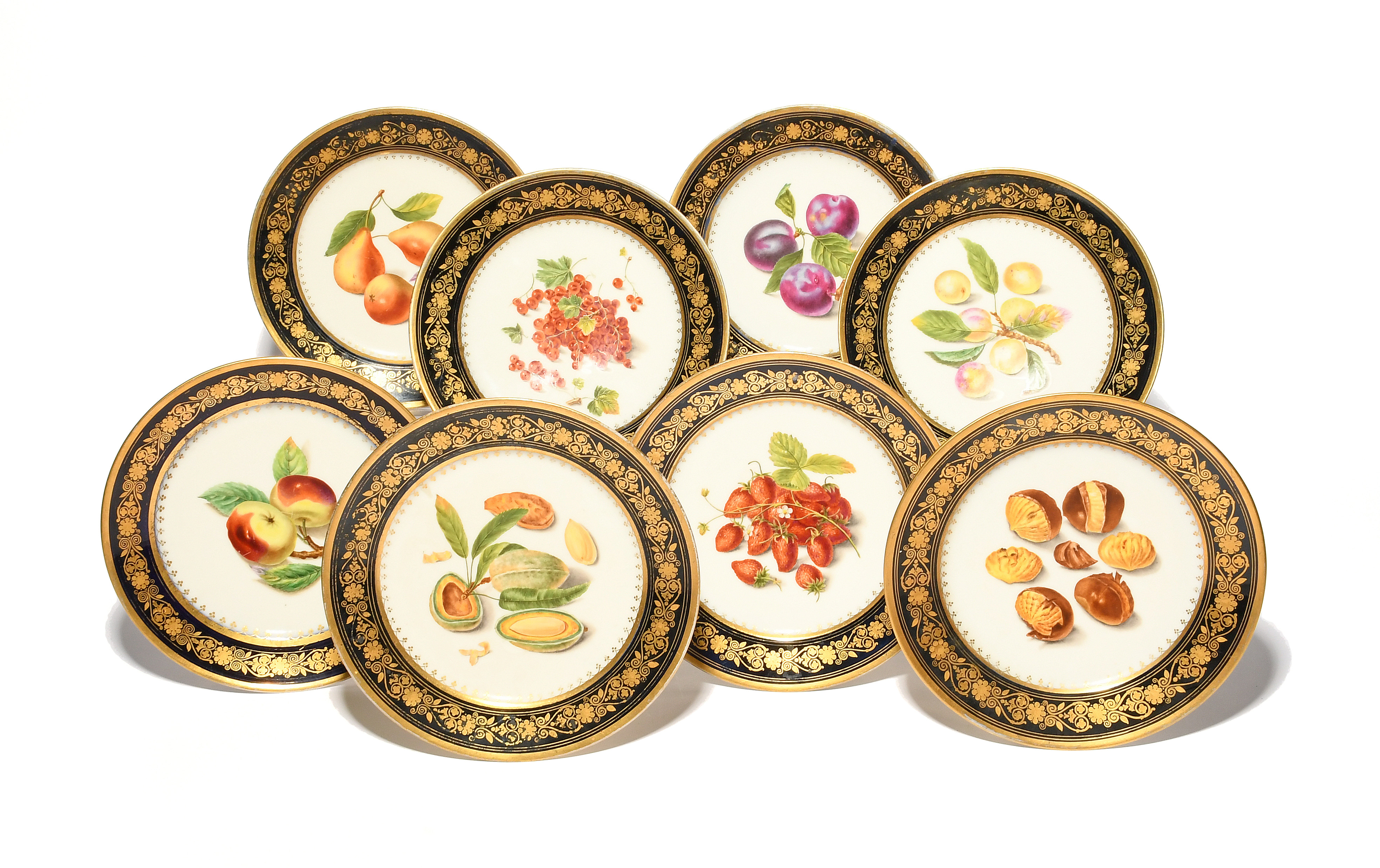Eight de Foësy (Paris) porcelain fruit plates, 1st half 19th century, painted to the wells with naturalistic specimens of peaches, apples, cob nuts, almonds, strawberries, sweet chestnuts and redcurrants, the rims with formal gilt floral borders on a black ground, printed factory marks, some gilt wear, 23.2cm. (8)