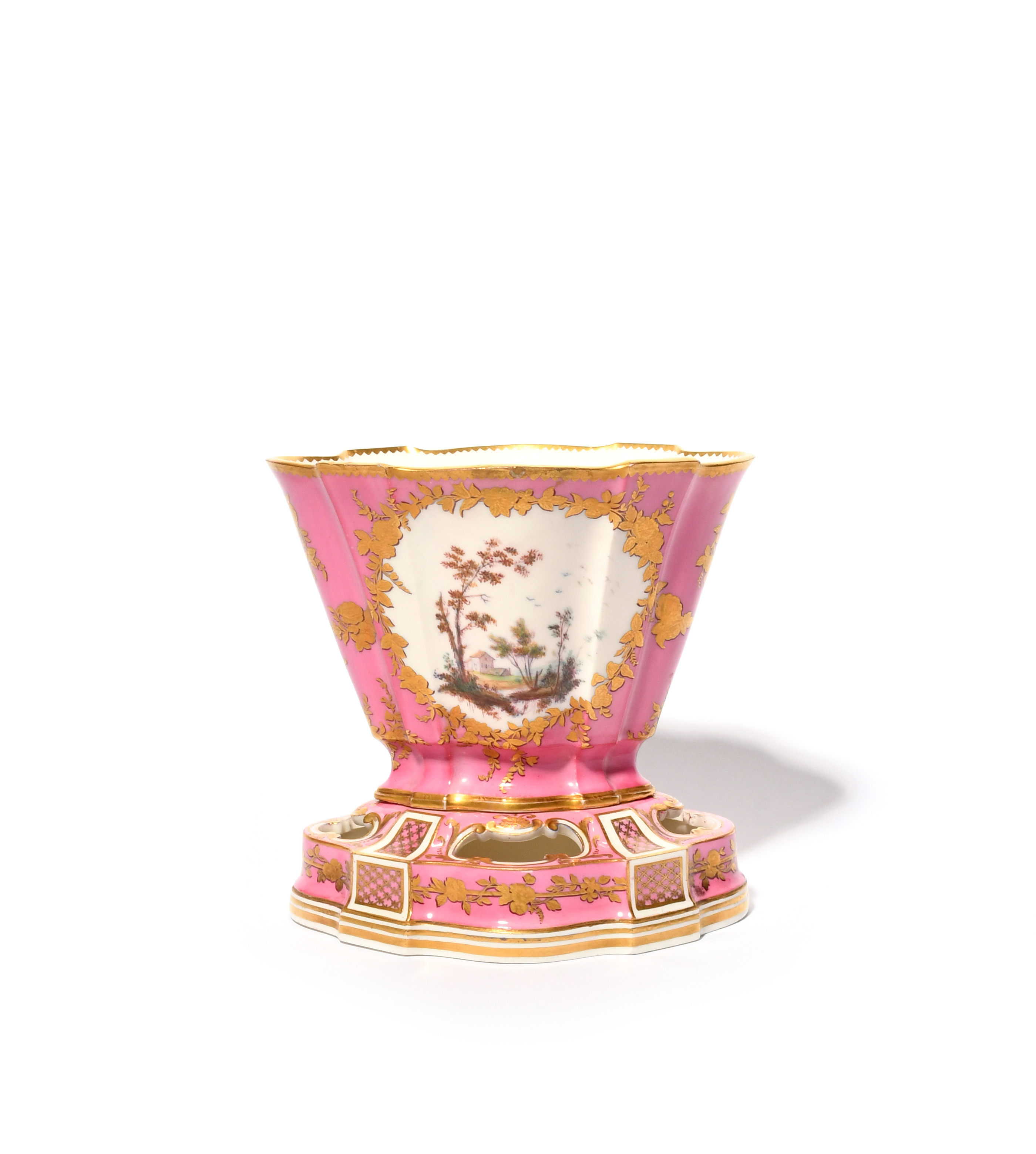 A Sèvres 'vase hollandois' bulb vase and stand, the porcelain c.1760, later decorated with panels of trees and buildings within floral gilt borders reserved on a pink ground, the quatrefoil stand pierced with four shaped openings for bulbs, 17cm high. (2)
