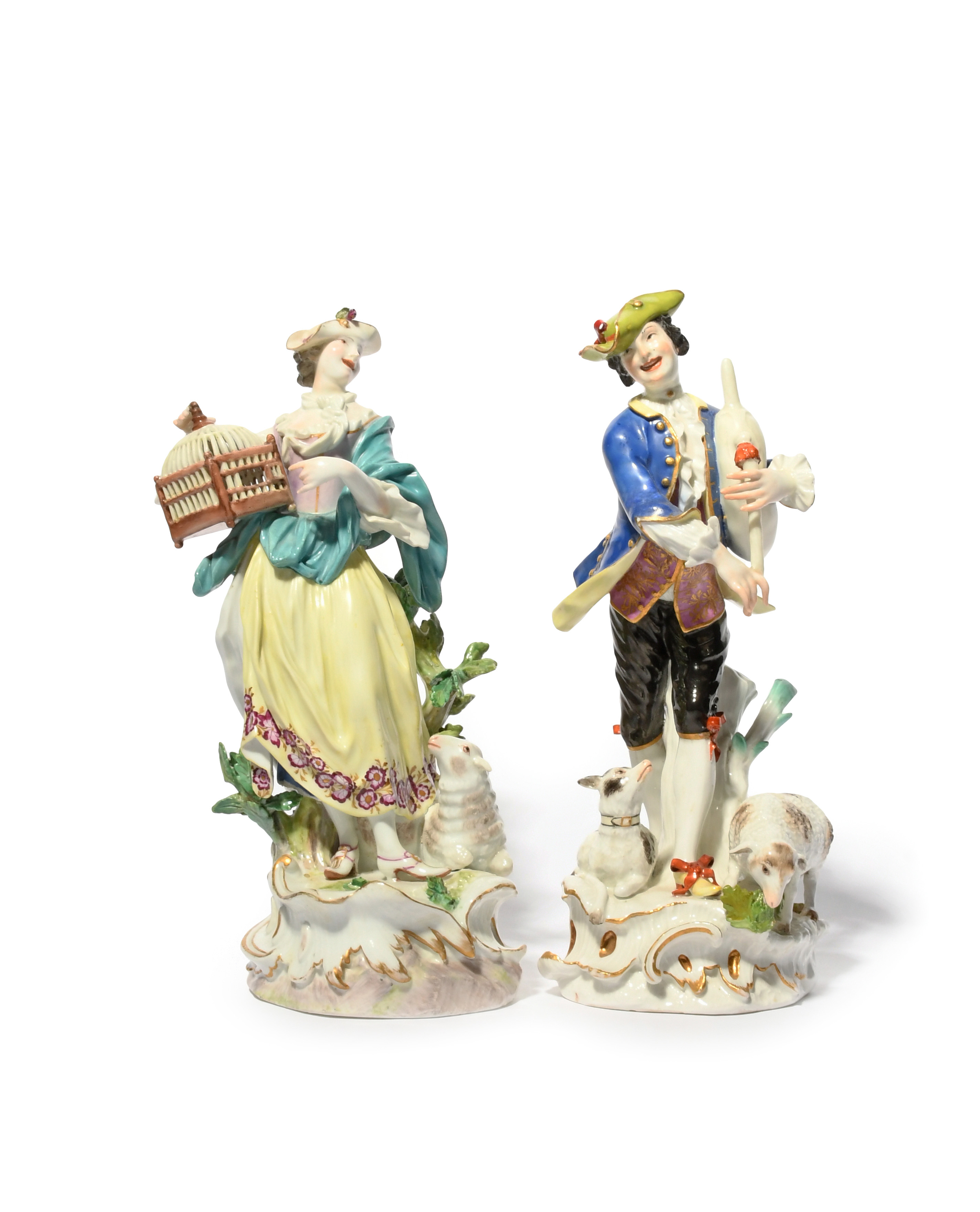 A near pair of Meissen figures of a musical shepherd and his companion, c.1750-60, modelled by J J Kändler, he carrying bagpipes, a dog by his side and a sheep nibbling leaves, his companion carrying a bird cage, standing beside a recumbent sheep, each raised on a scroll base with gilt detailing, blue crossed swords marks, small restorations, 26cm. (2)