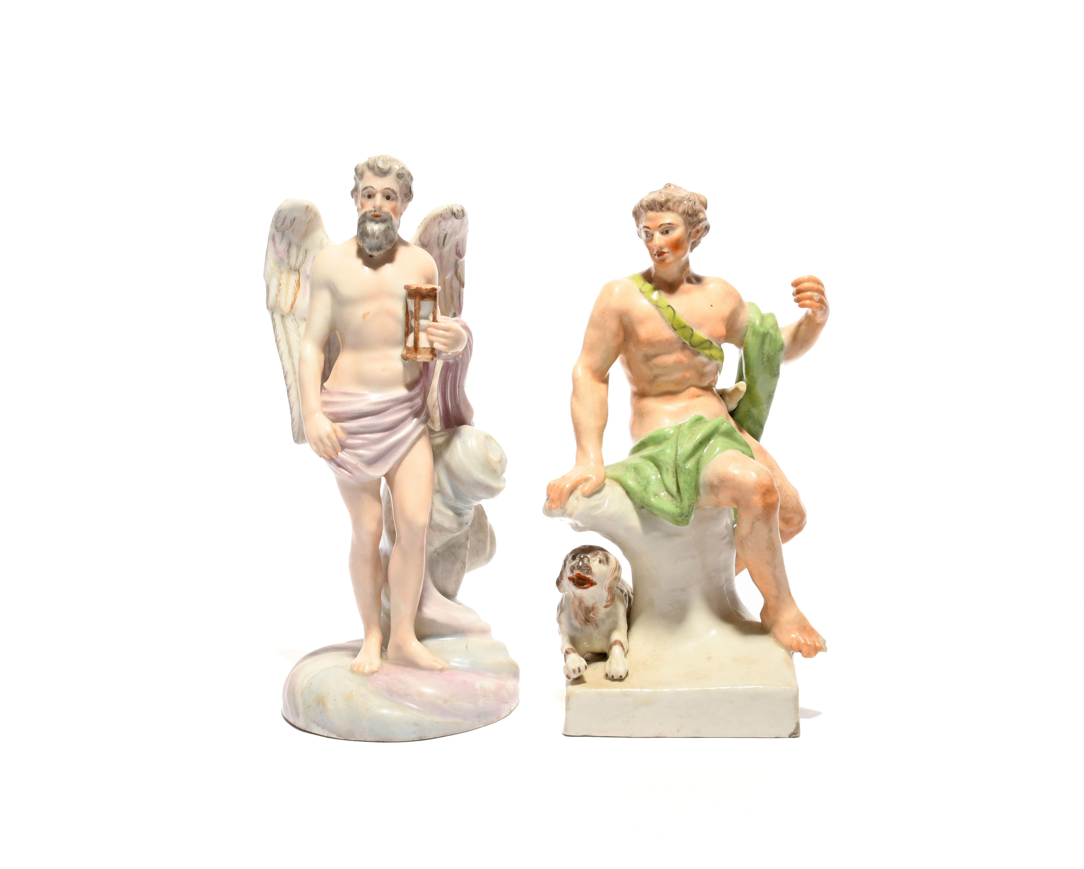 A Kloster Veilsdorf figure of Mars or Apollo, c.1765-70, modelled by Friedrich Eugen Döll and Wenzel Neu, seated on a low tree stump with a hunting horn slung over one shoulder and a dog by his side, and another figure of Father Time, probably also Kloster Veilsdorf, standing before cloud scrolls and holding an hourglass, small losses, 18.2cm max. (2)