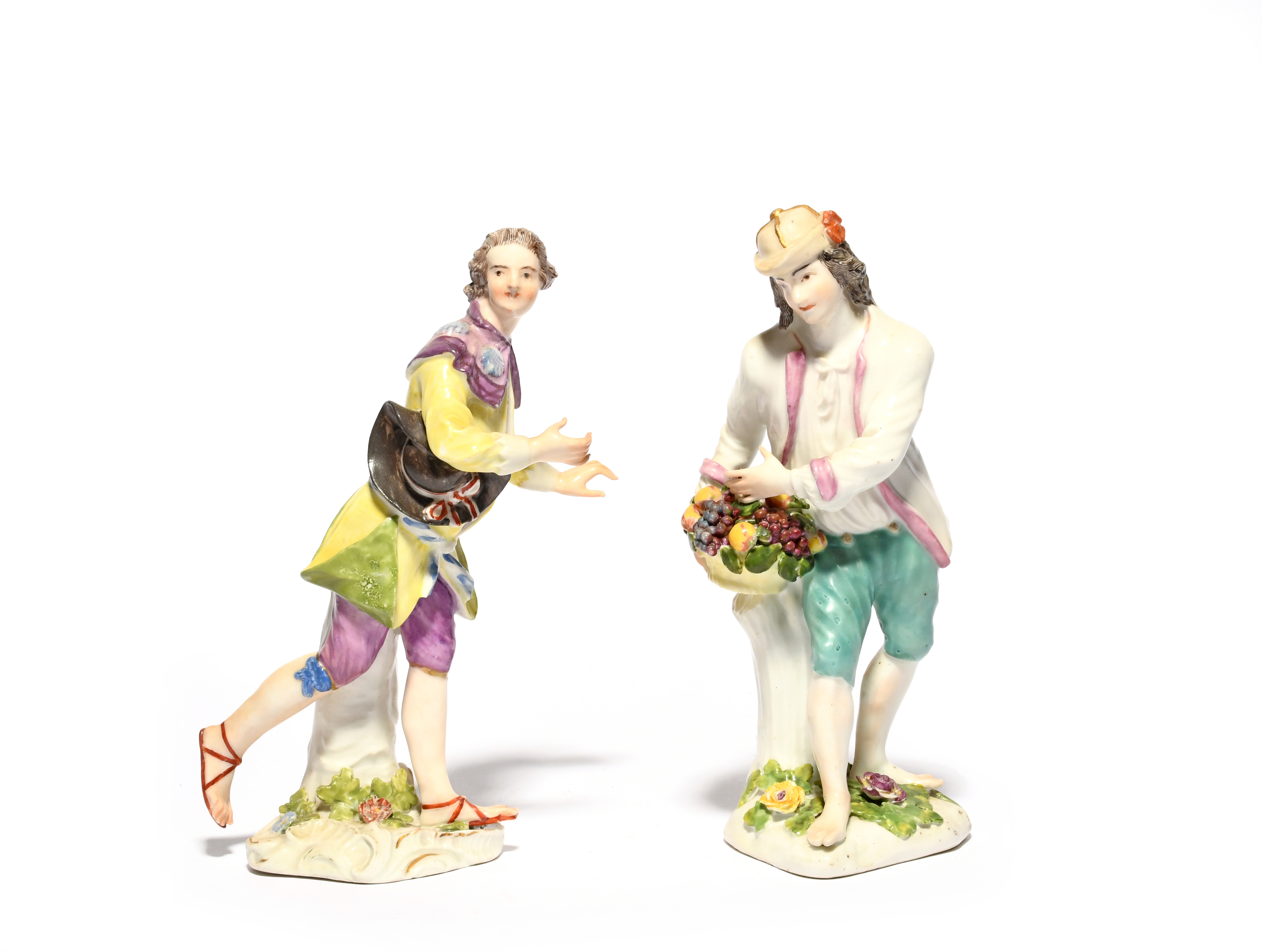 A Meissen figure of a pilgrim, mid 18th century, modelled by Peter Reinicke in a dynamic pose, wearing a caplet with scallop shell motifs over a yellow jacket, and a Meissen figure of a gardener standing barefoot beside a basket of fruit, restorations, 18cm max. (2)