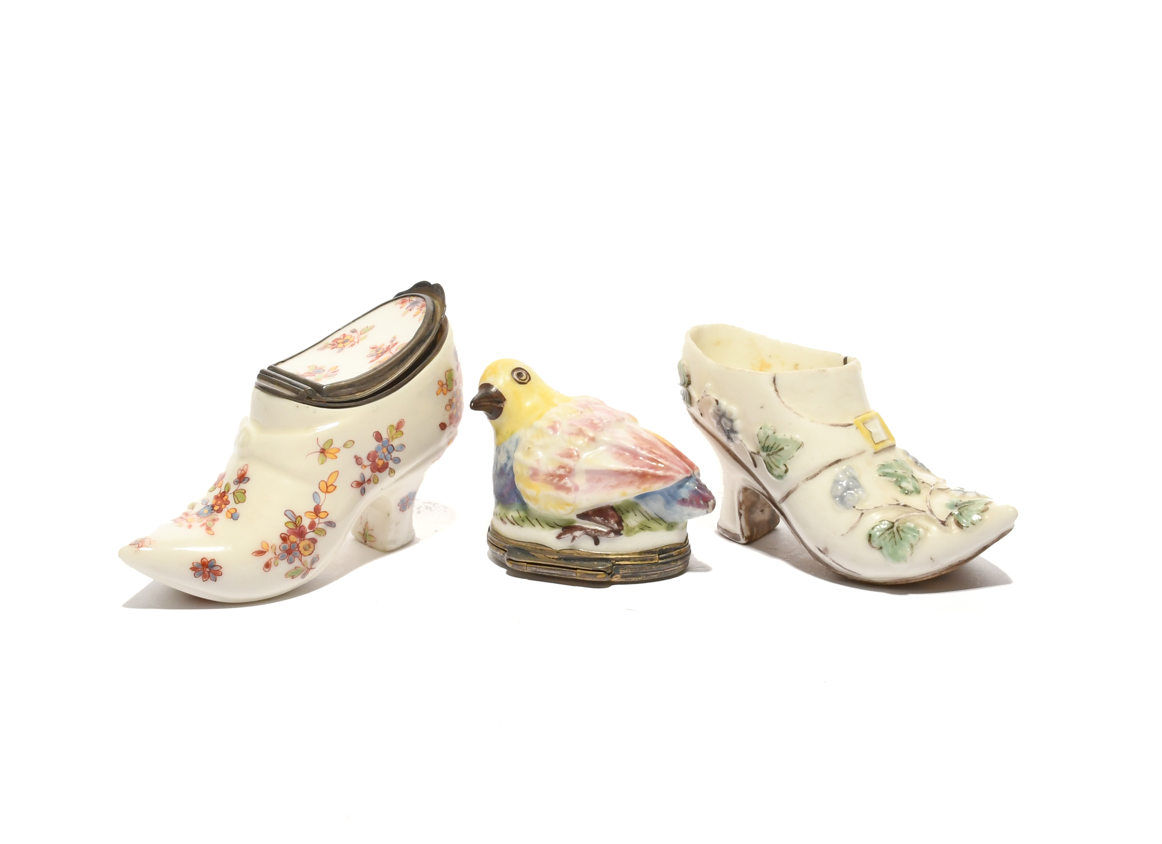 Three French porcelain bonbonnieres, c.1740, two St Cloud and modelled as buckled heeled shoes, one painted with small flower sprays in Kakiemon enamels, the other applied with grapevine, and last Mennecy and modelled as a bird with head turned to the left, with an egg-shaped silver-mounted lid, one shoe missing its lid, 8.3cm max. (3)