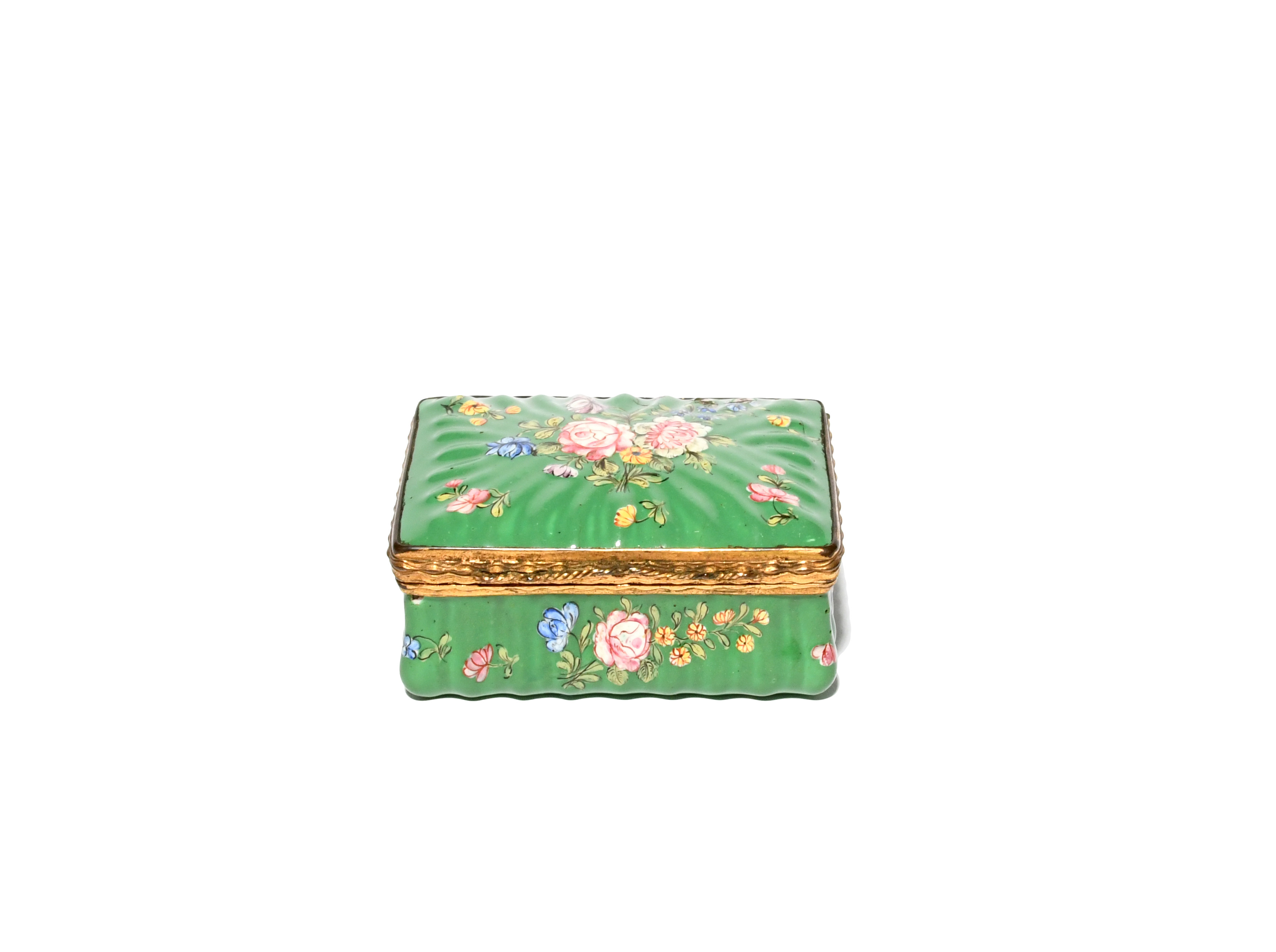 A good English enamel rectangular snuff box, late 18th/early 19th century, perhaps London, moulded with flutes and finely painted with flowers on a rich green ground, with elaborately turned gilt metal mounts, 6.2cm across.