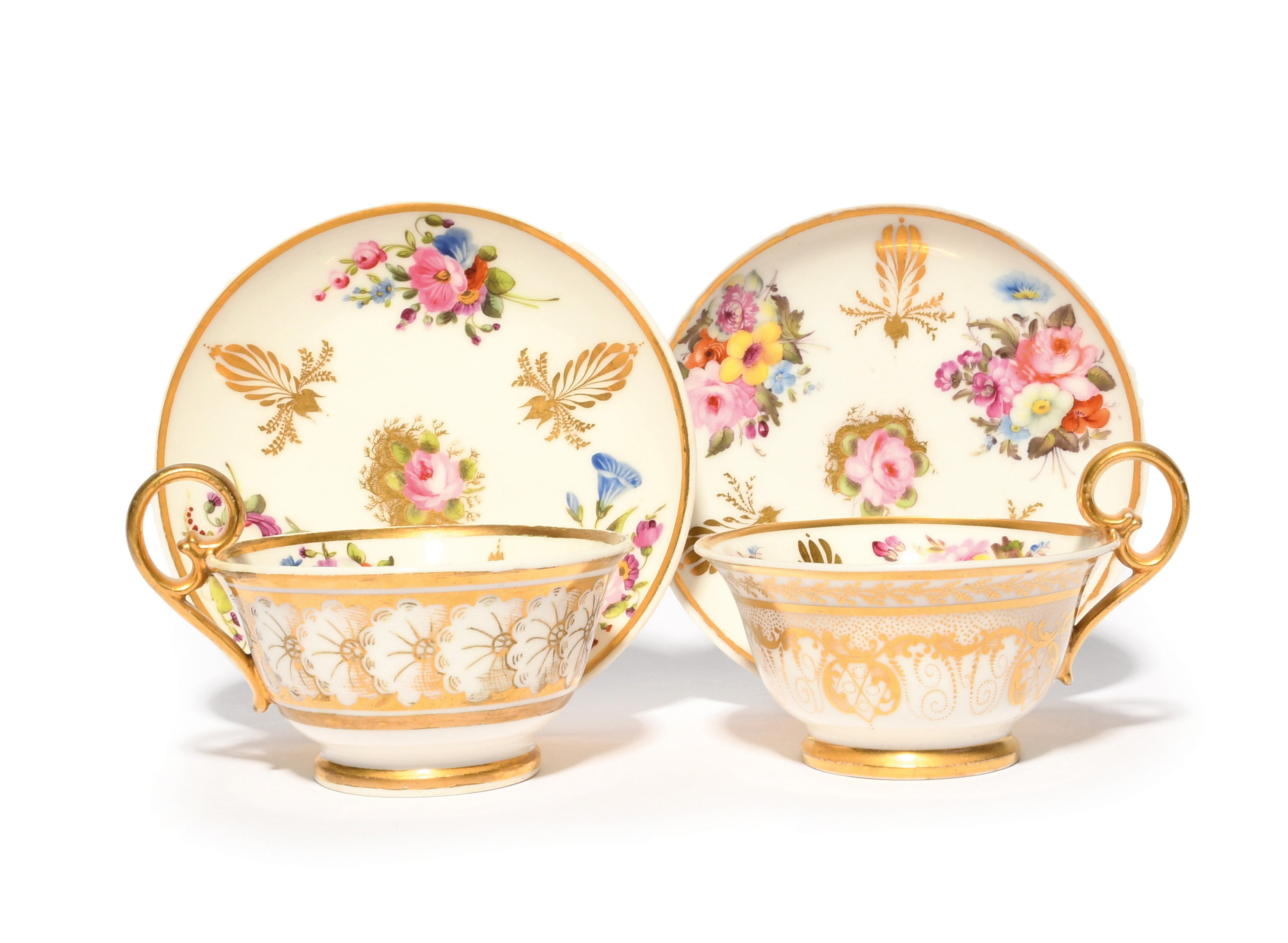 Two Nantgarw teacups and saucers, c.1815-18, painted with sprays of rose and other garden flowers flanked by gilt anthemion, the cups' exteriors with varying gilt foliate and floral designs, 13.7cm max. (4)