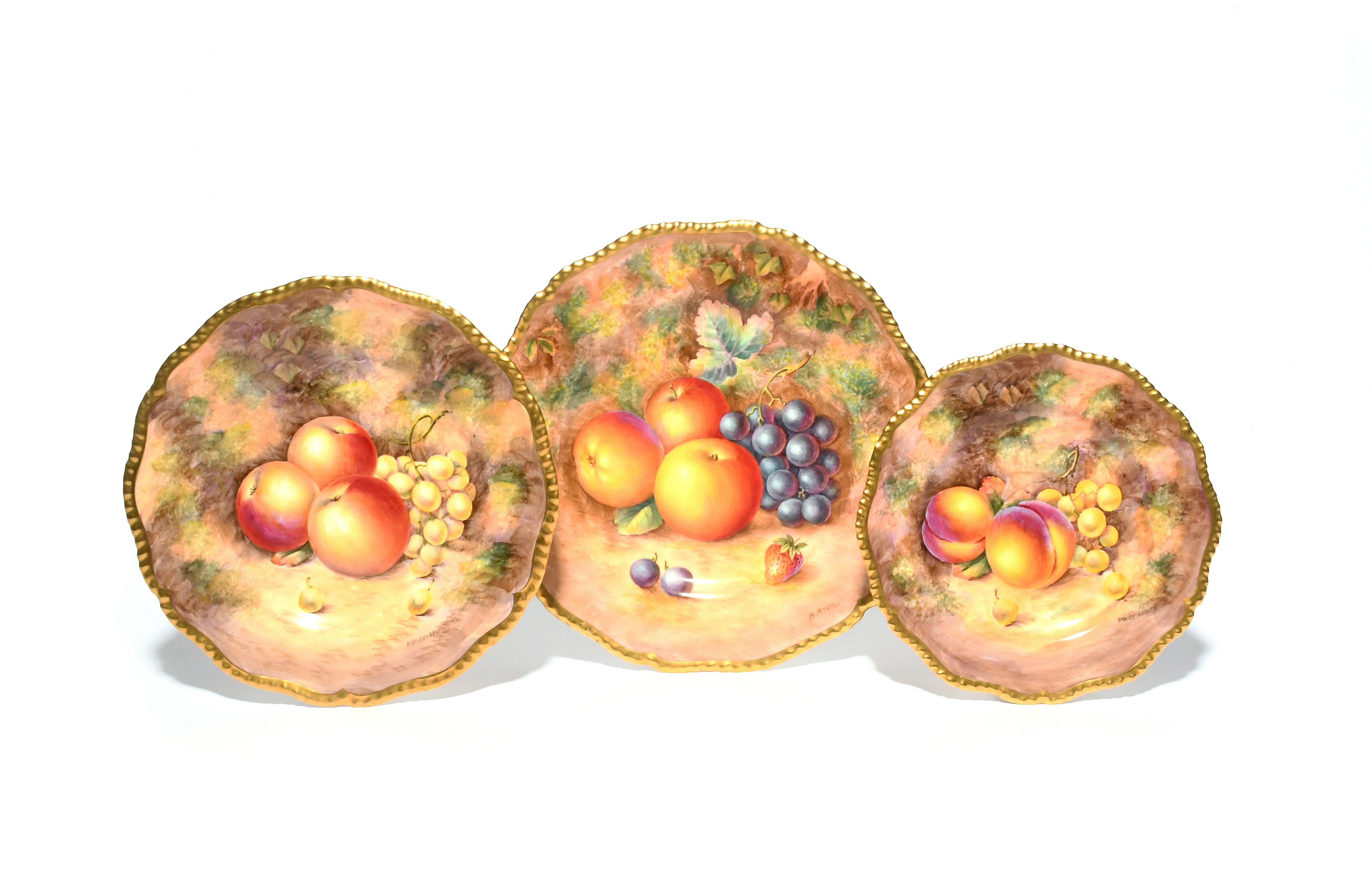 Three Royal Worcester fruit plates, modern, of varying size, painted by Sibley Lewis and H Ayrton with arrangements of fruit including peaches, grapes, apples and a strawberry on a mossy ground, signed, black printed marks, 27cm max. (3)