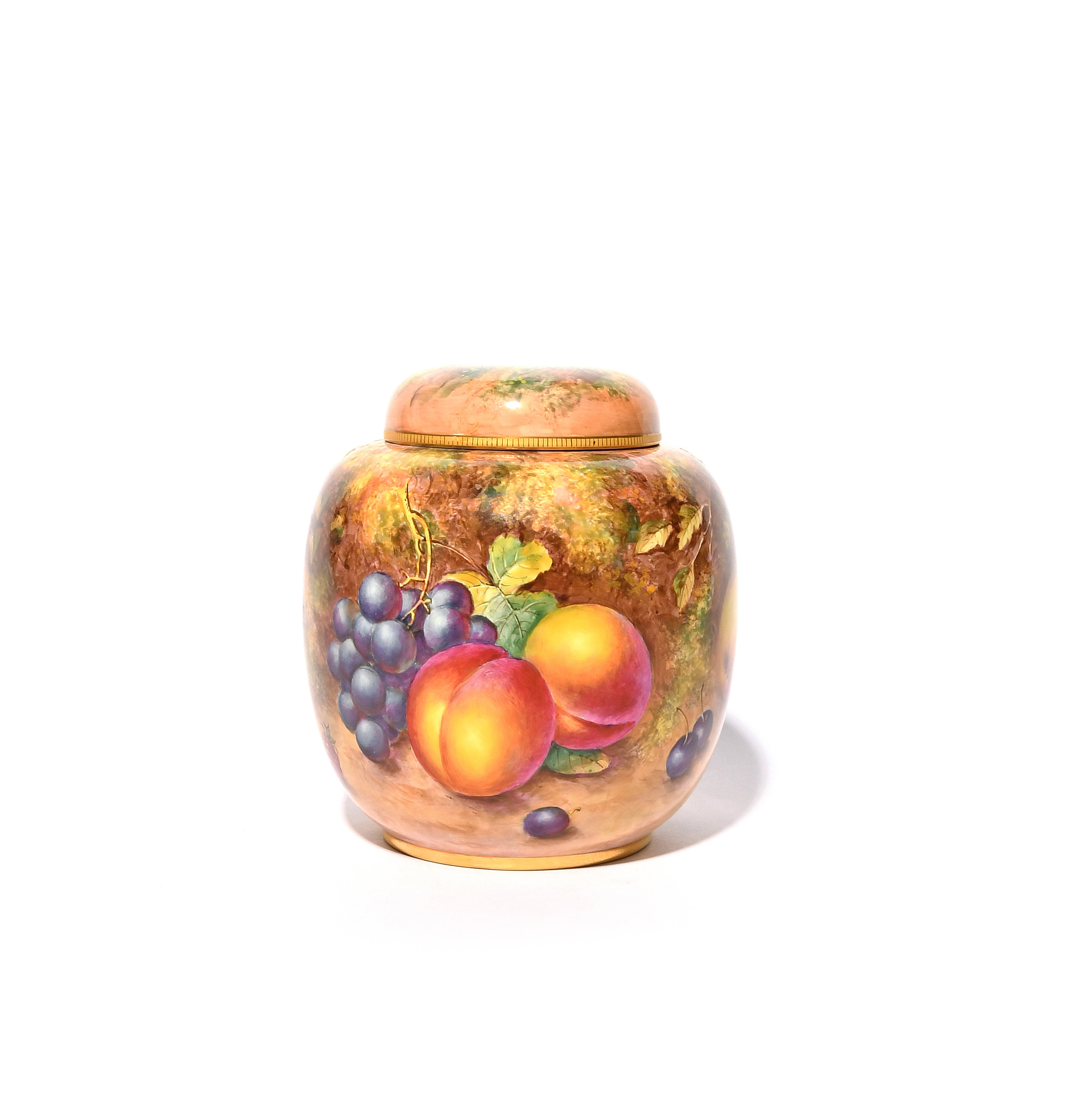 A Royal Worcester vase and cover, 20th century, shape number 2826, painted by John Freeman with an arrangement of fruit including apples, grapes, cherries and blackberries on a woodland floor, signed, black printed mark, 17.5cm (2)