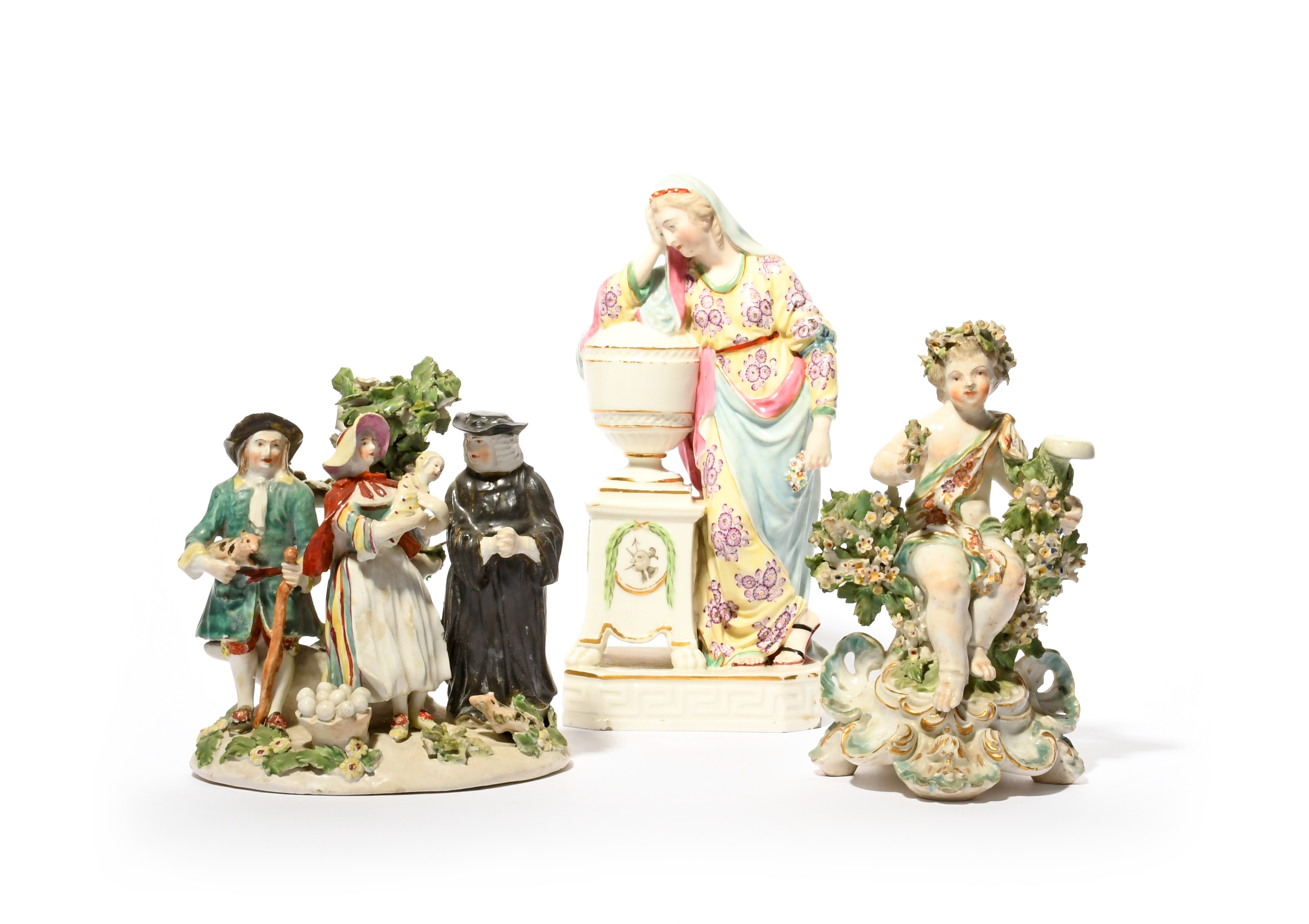 Three Derby figures, c.1760-80, one of Andromache weeping over the ashes of Hector, after the painting by Angelica Kauffman, another of the Tithe Pig group, the last a candlestick figure of a seated putto, some damages, 23.5cm max. (3)