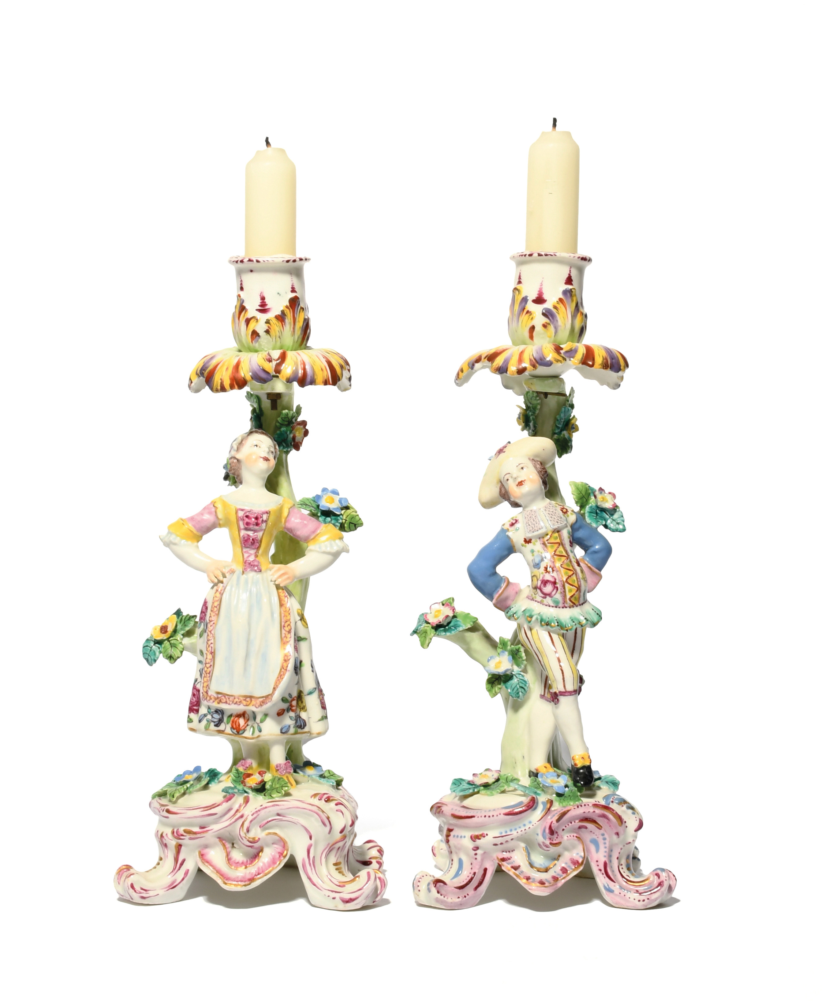 A rare matched pair of Bow candlestick figures of the Dutch Dancers, c.1765-70, he standing with his hands behind his back and right leg extended, she with her hands on her hips, each on a footed base before a flowering tree stump supporting a scrolled and colourful candle sconce, 26cm. (2)