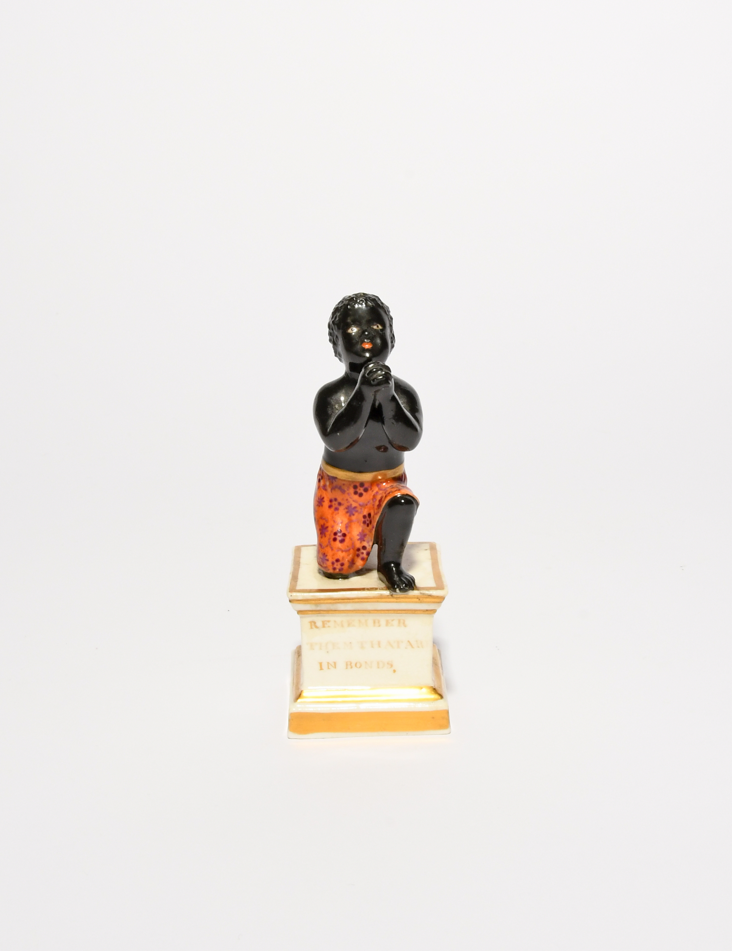 A rare Derby anti-slavery figure, early 19th century, modelled as a young black slave on one knee with hands clasped, raised on a square base inscribed in gilt with Hebrews 13:3 'Remember them that are in bonds', iron red crowned Derby mark, some good restoration, 10.3cm.