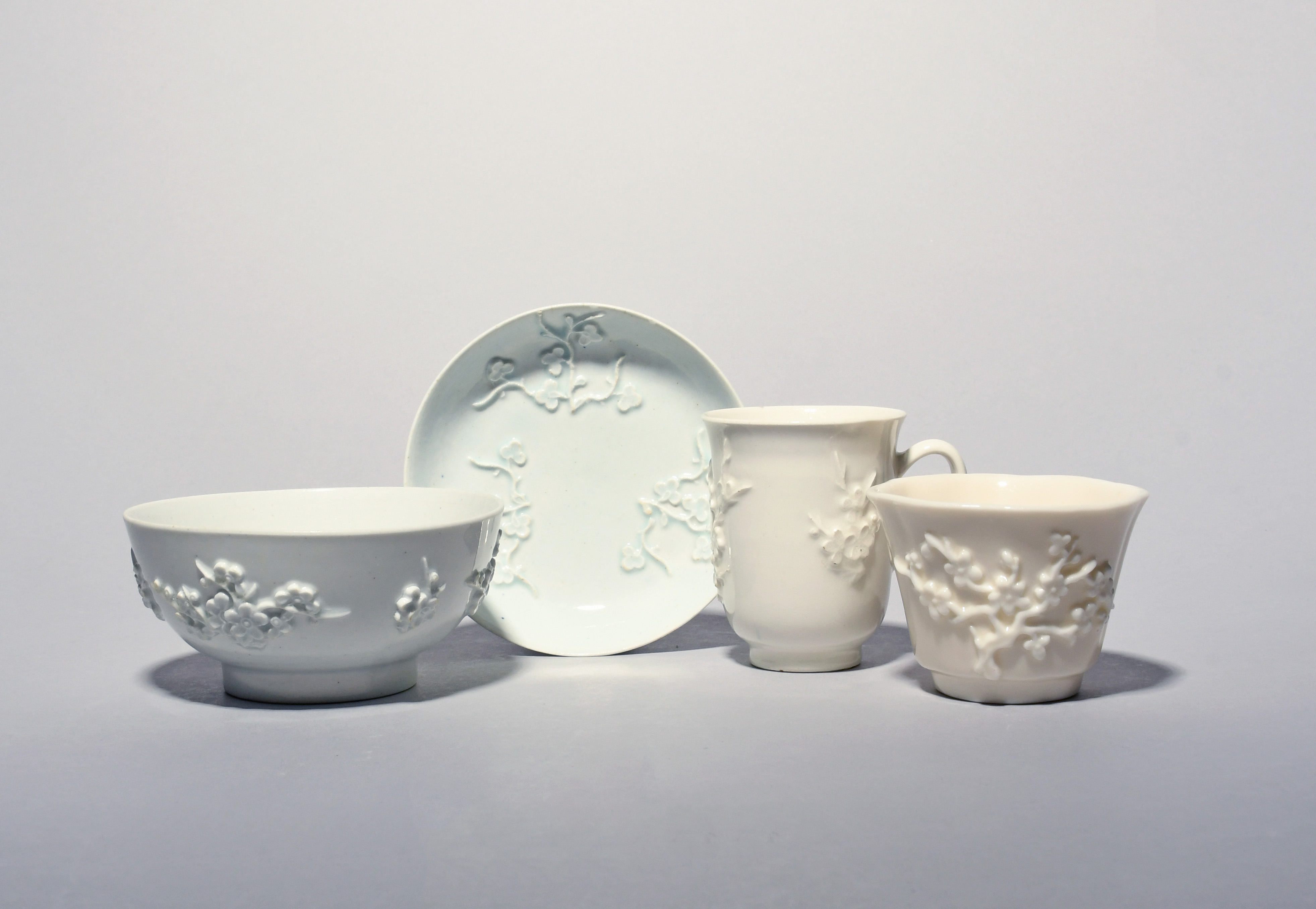 A Bow white-glazed chocolate cup, a saucer and a slop bowl, c.1752-55, the cup and bowl sprigged with branches of flowering prunus, the saucer with sprays of magnolia, and a Chinese blanc de Chine lobed beaker or teabowl with similar decoration, early 18th century, moulded flowerhead to the underside, small rim chips, 11.7cm max. (4)
