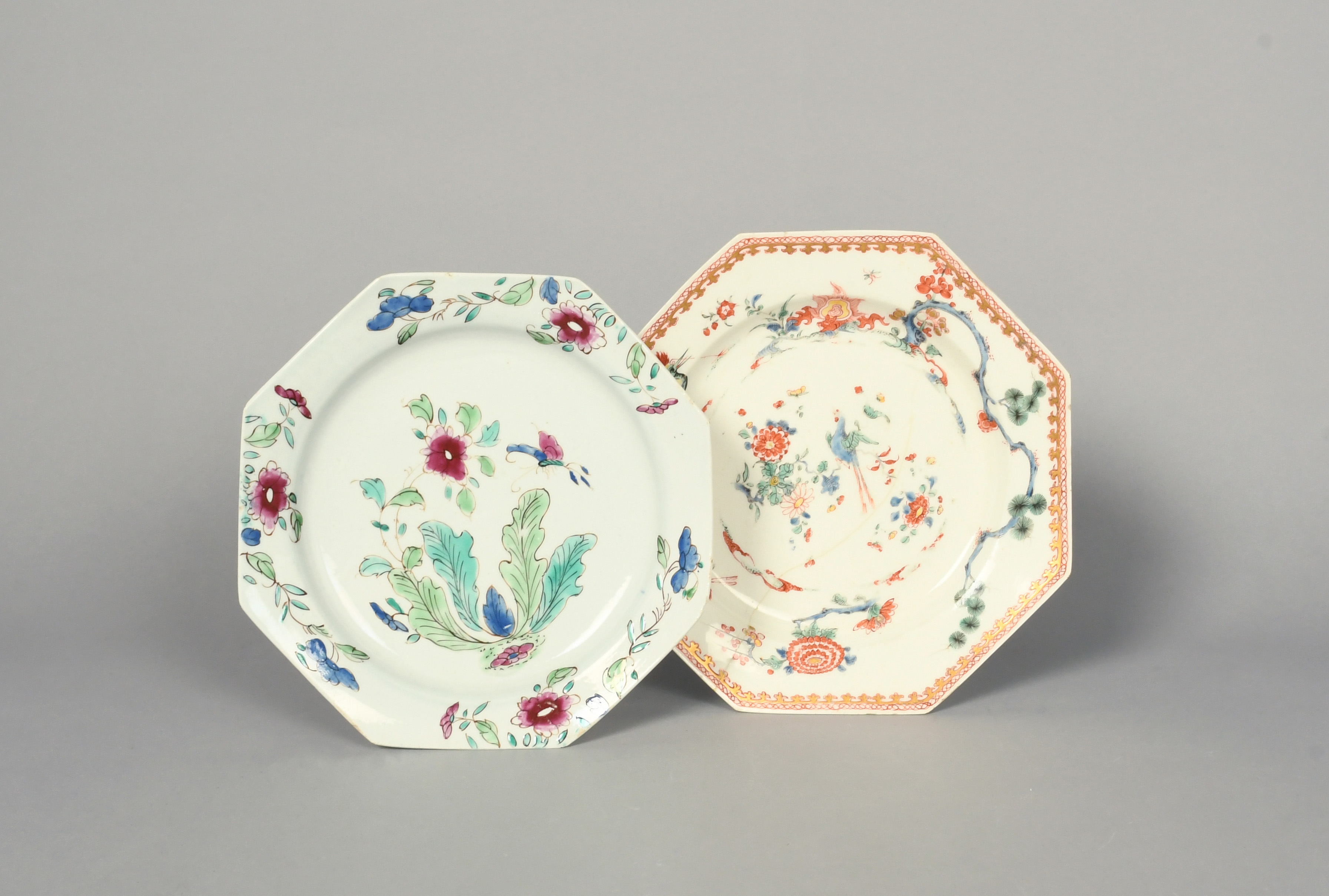 Two Bow octagonal plates, c.1752-55, one painted in Kakiemon enamels with exotic birds and a dragon around flowering branches and a pine tree, the rim with a gilt spearhead border, the other painted in famille rose enamels with a flying insect above simple flowering plants, the former with a long rim crack, 23.6cm max. (2)