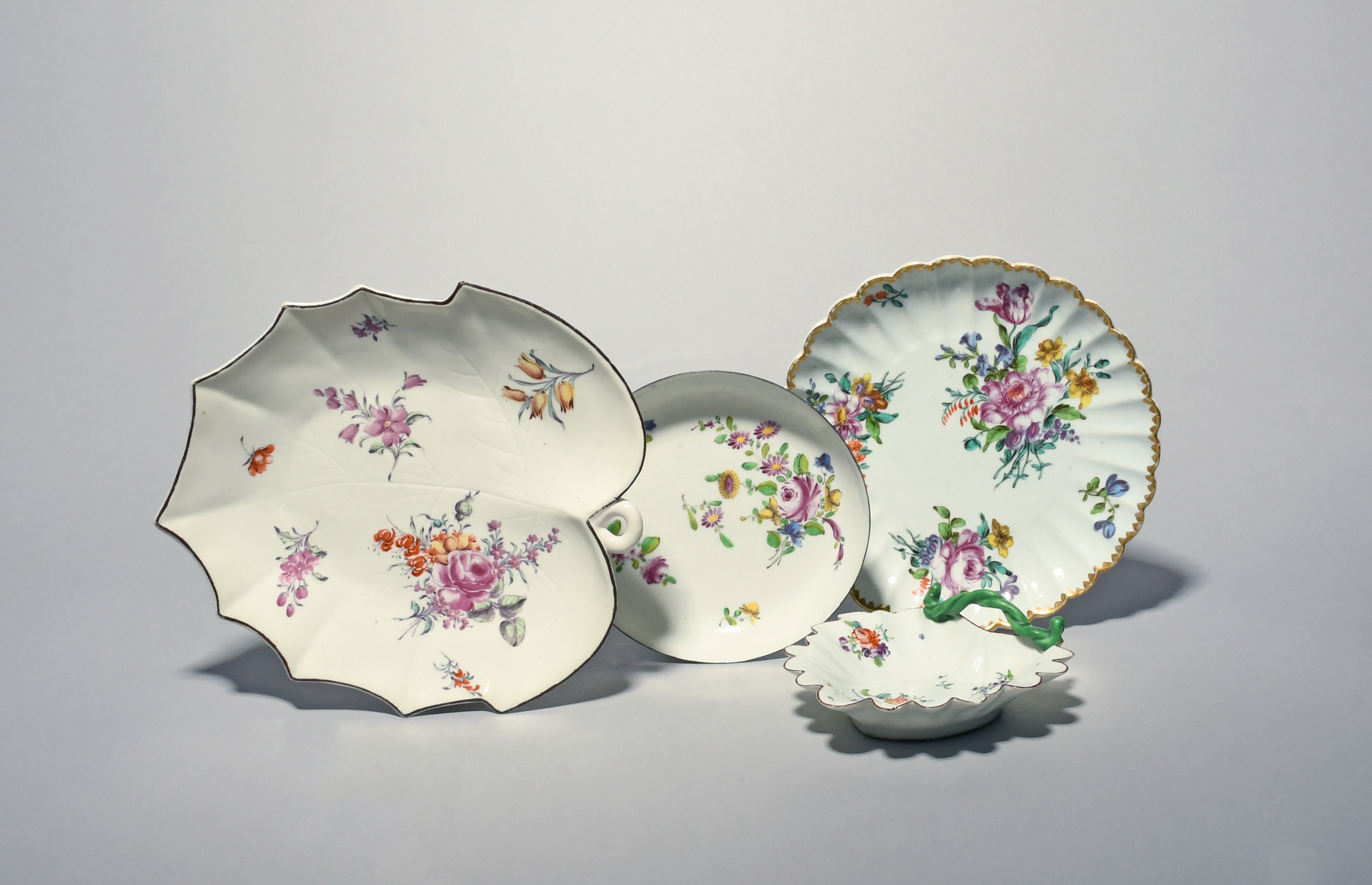 A Chelsea leaf dish, c.1755, painted with a spray of flowers and single scattered sprigs, moulded to the underside, a small Longton Hall leaf dish of triangular form, a fluted Bow plate boldly painted with floral arrangements within a gilt rim, and a large Bow saucer painted with European flowers, minor faults, 23.2cm max. (4)