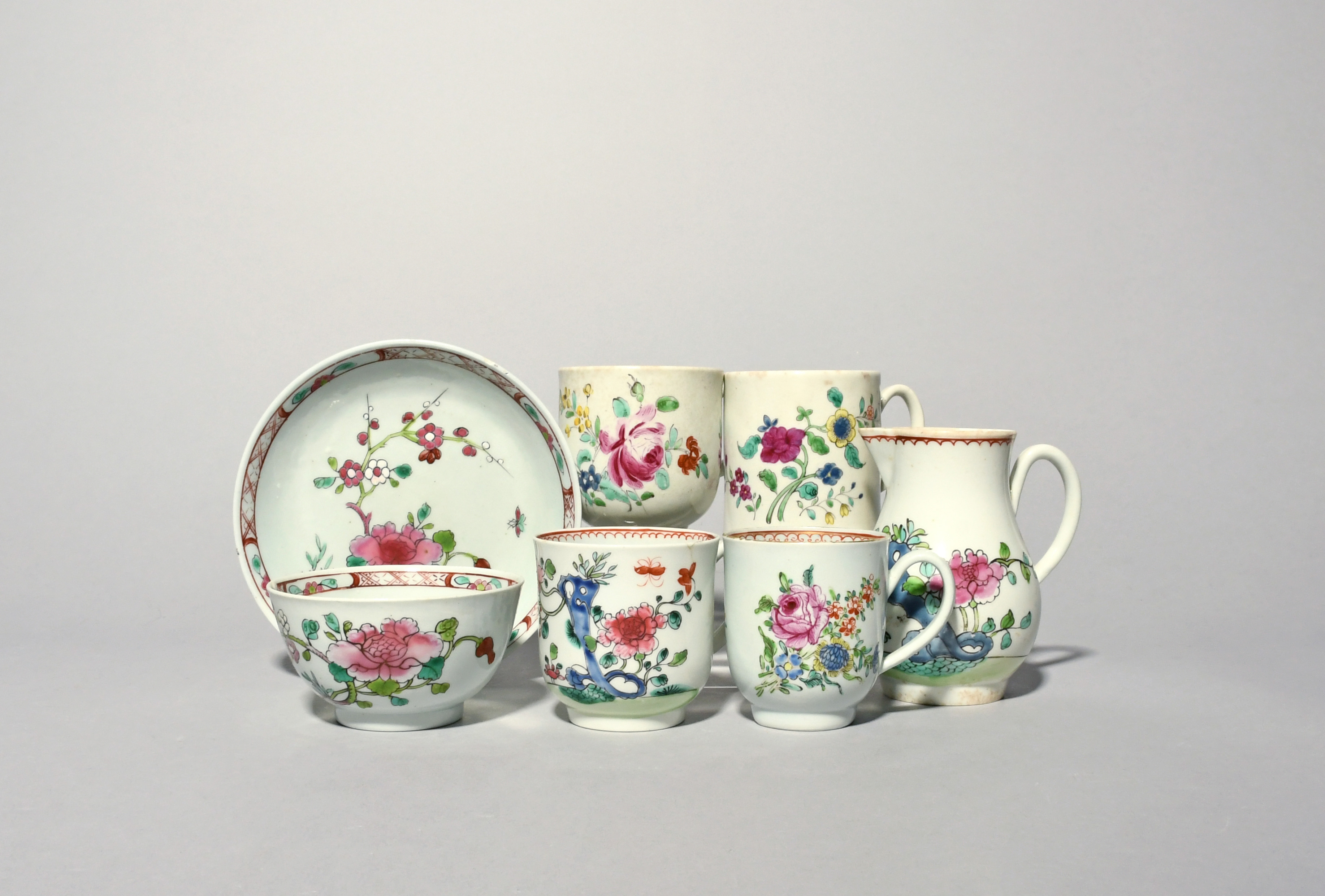 A small group of Liverpool teawares, c.1760-65, including a teabowl and saucer, three coffee cups, a coffee can and a milk jug, variously decorated with sprays of flowering peony, two cups with sprays of European flowers, the can with a bird in flight beside flowers, 12.4cm max. (7)
