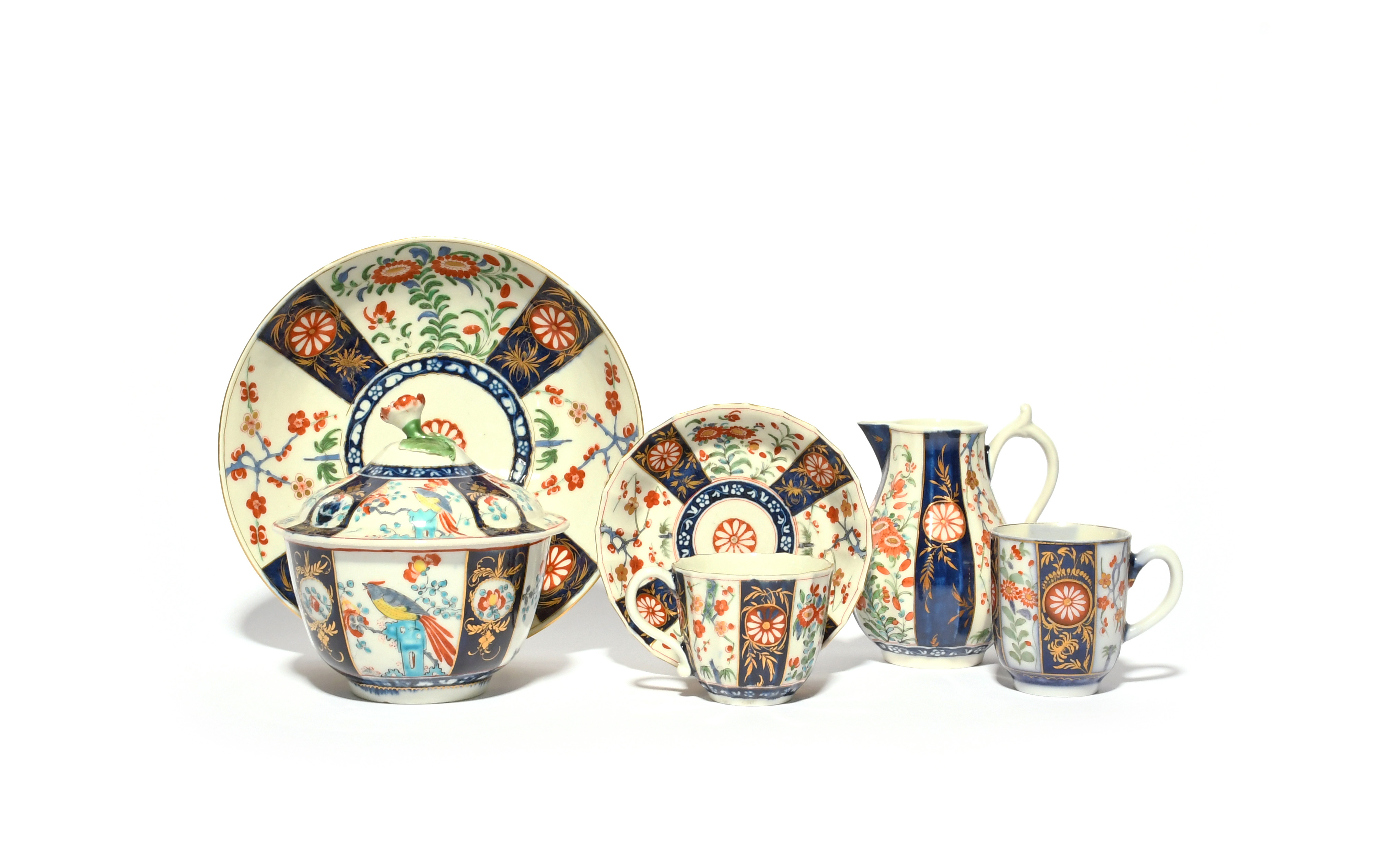 A Worcester sucrier and cover, c.1760, painted in a panelled variation of the Sir Joshua Reynolds pattern with long-tailed birds and Kakiemon flowers, a fluted Worcester cup and saucer, a saucer dish and a milk jug, all decorated in a panelled Japan pattern, and a later hard-paste porcelain coffee cup, square seal marks, 18.7cm max. (7)