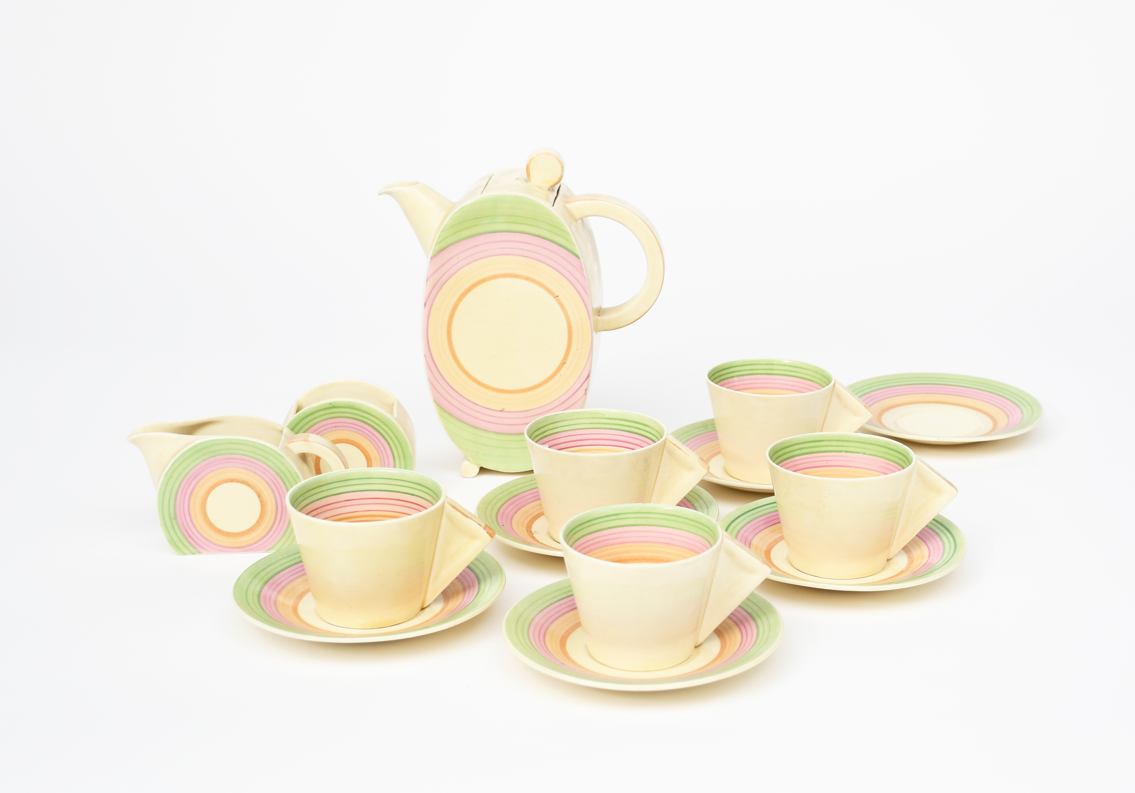 A Clarice Cliff Bon Jour coffee set, painted with green, pink and brown bands, comprising; coffee pot and cover, milk-jug and sugar basin, five Conical cups and six saucers, printed factory marks, 18cm. high (15)