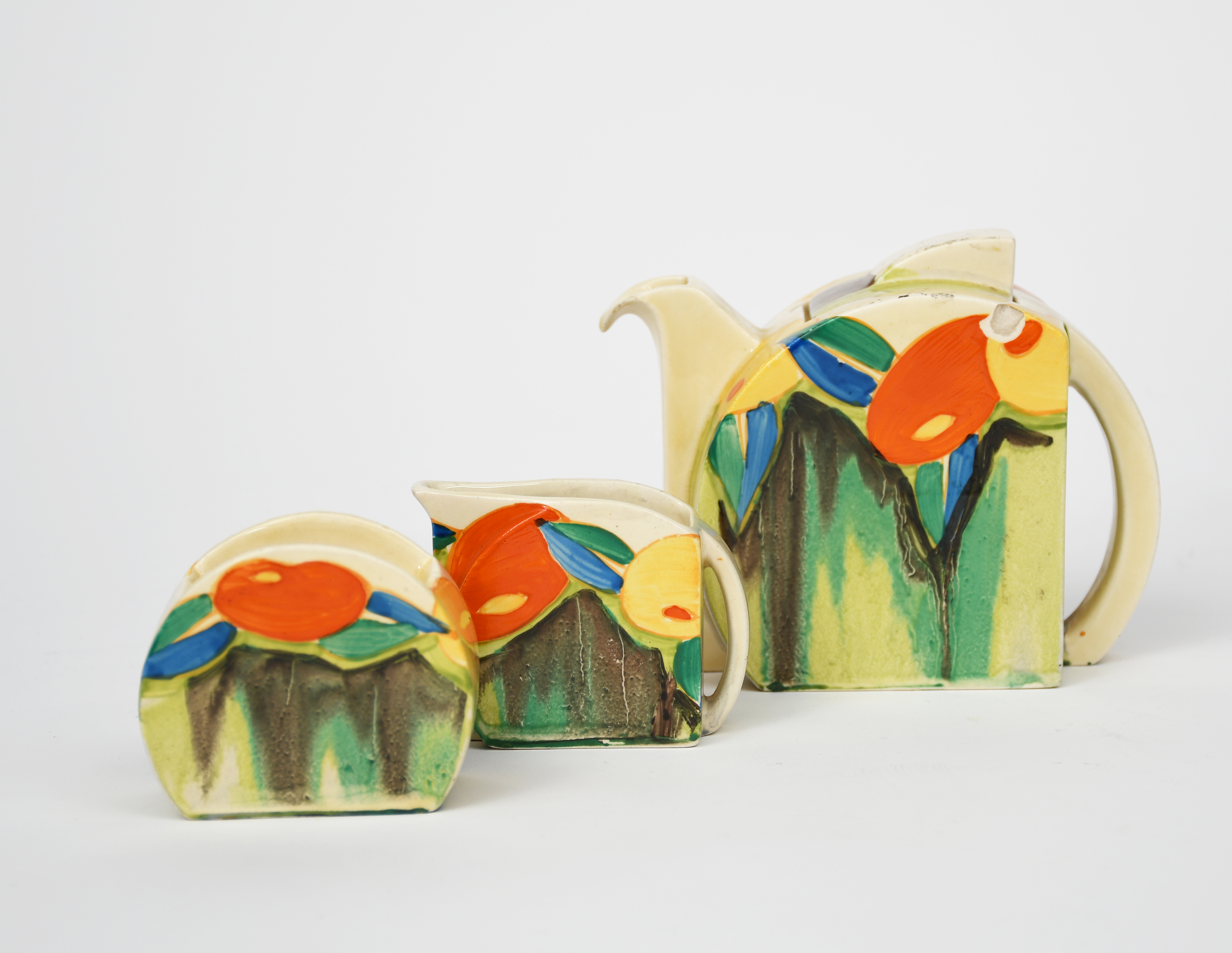 'Delecia Citrus' a Clarice Cliff Bizarre Stamford tea trio, comprising teapot and cover, milk-jug and sugar basin, painted in colours printed factory marks, chips to top rim of pot, 12.5cm. high (4)