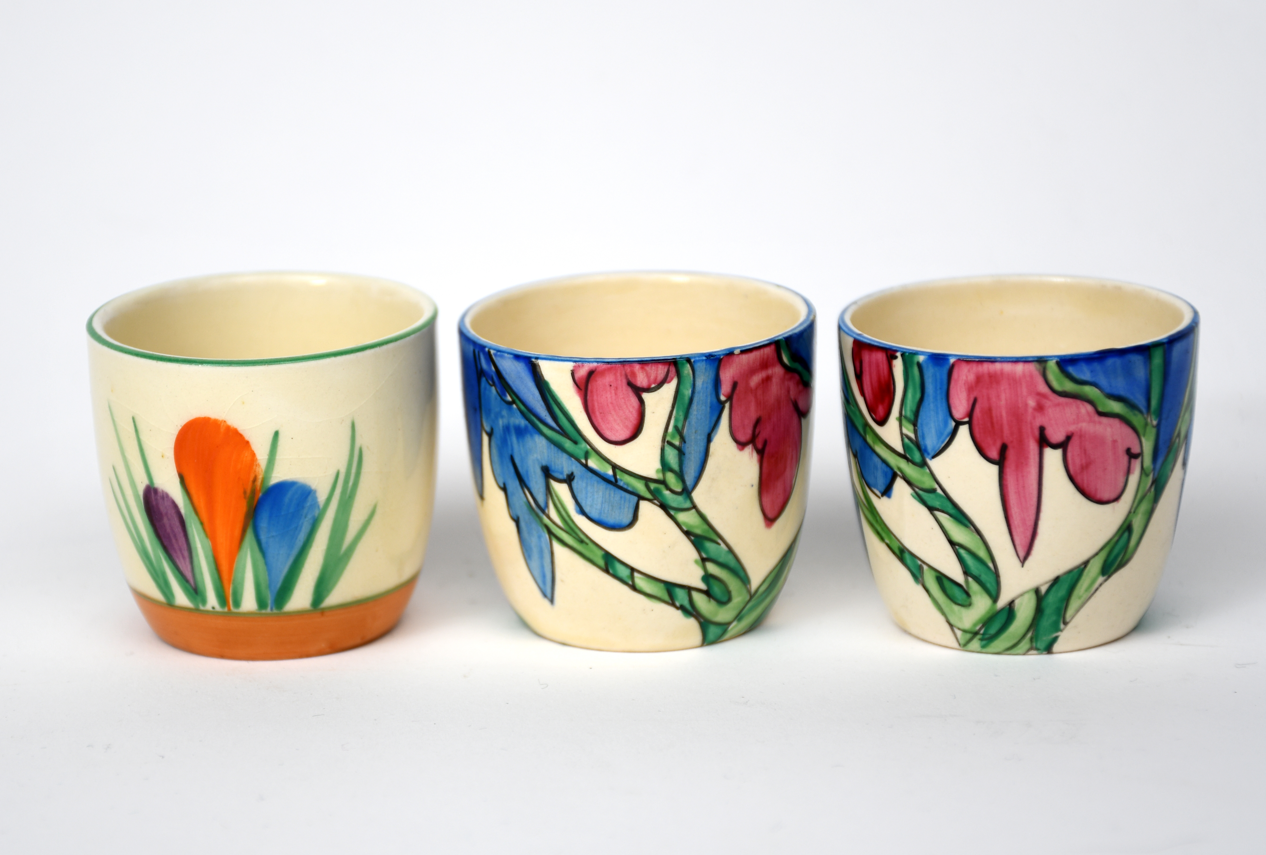 'Rudyard' two Clarice Cliff Fantasque Bizarre egg cups, painted in colours, and Clarice Cliff 'Crocus' egg cup, printed factory marks, 4cm. high (3)