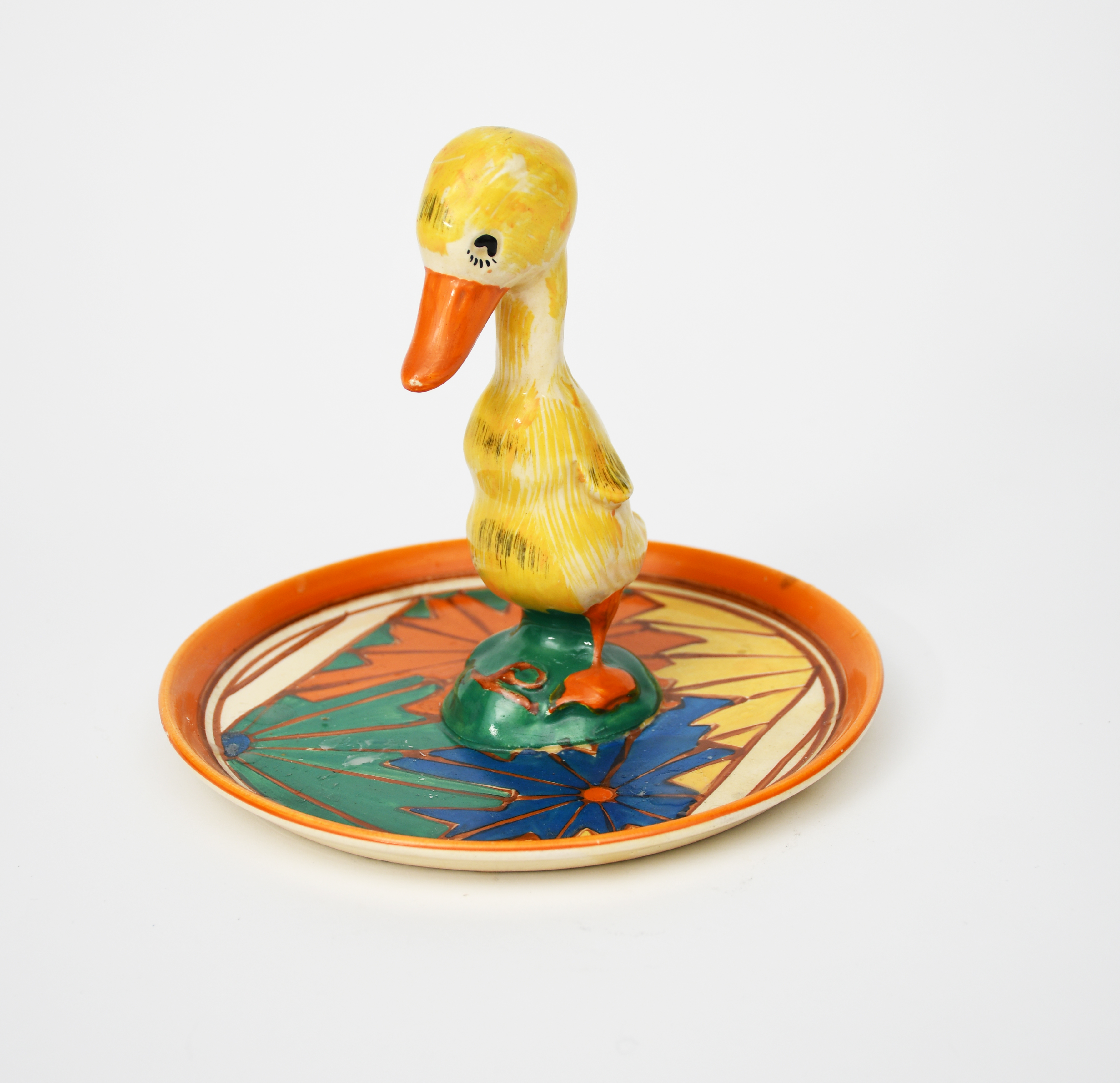 'Umbrellas' a Clarice Cliff Fantasque Bizarre duck egg cruet tray, painted in colours, printed factory marks, duck handle restored to legs,